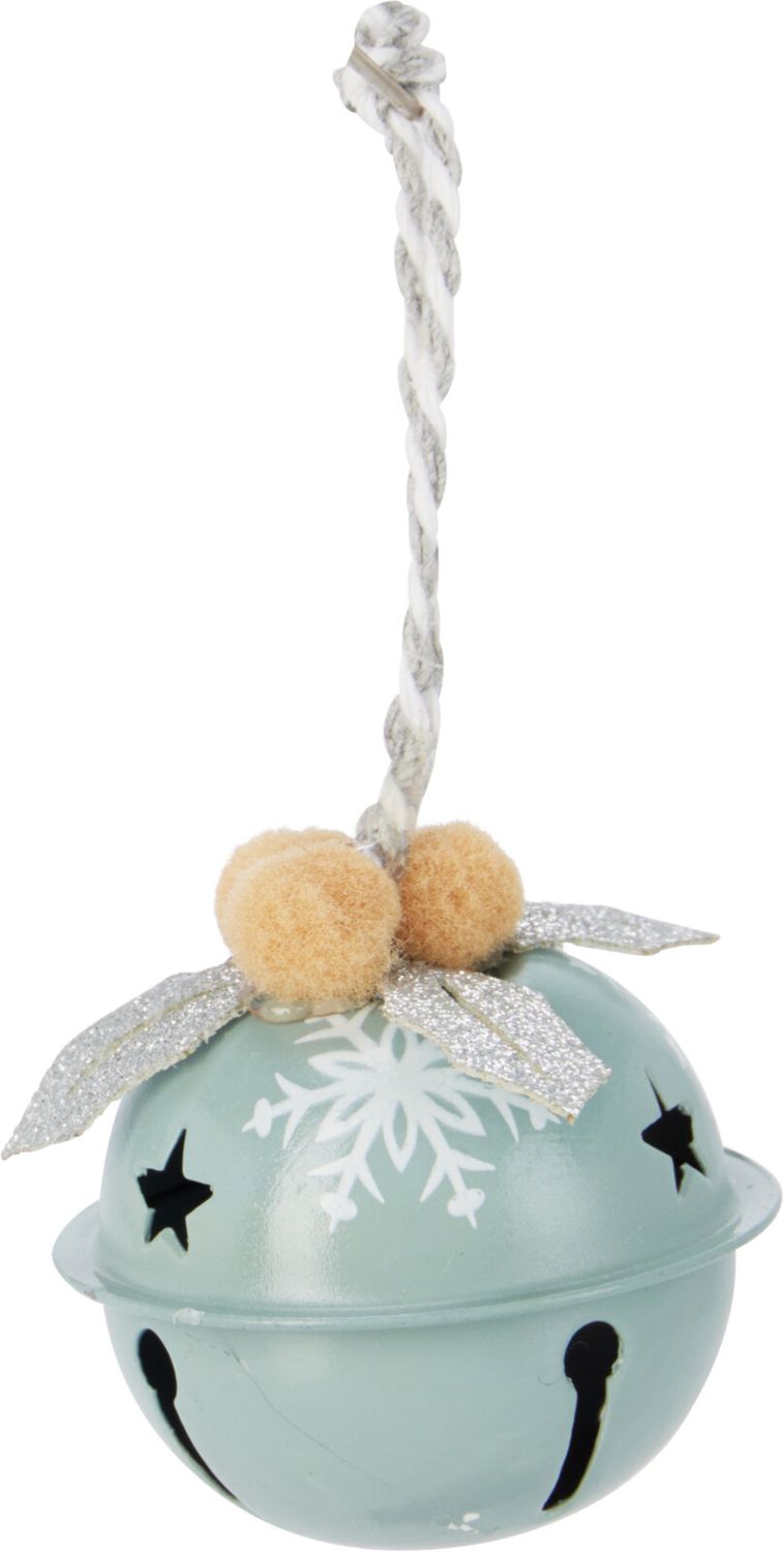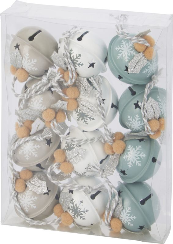 Ein 12-teiliges Christbaumschmuck-SET aus Metallglocken mit Schneeflocken in den Farben Salbei, Taupe und Weiß, liebevoll verziert.