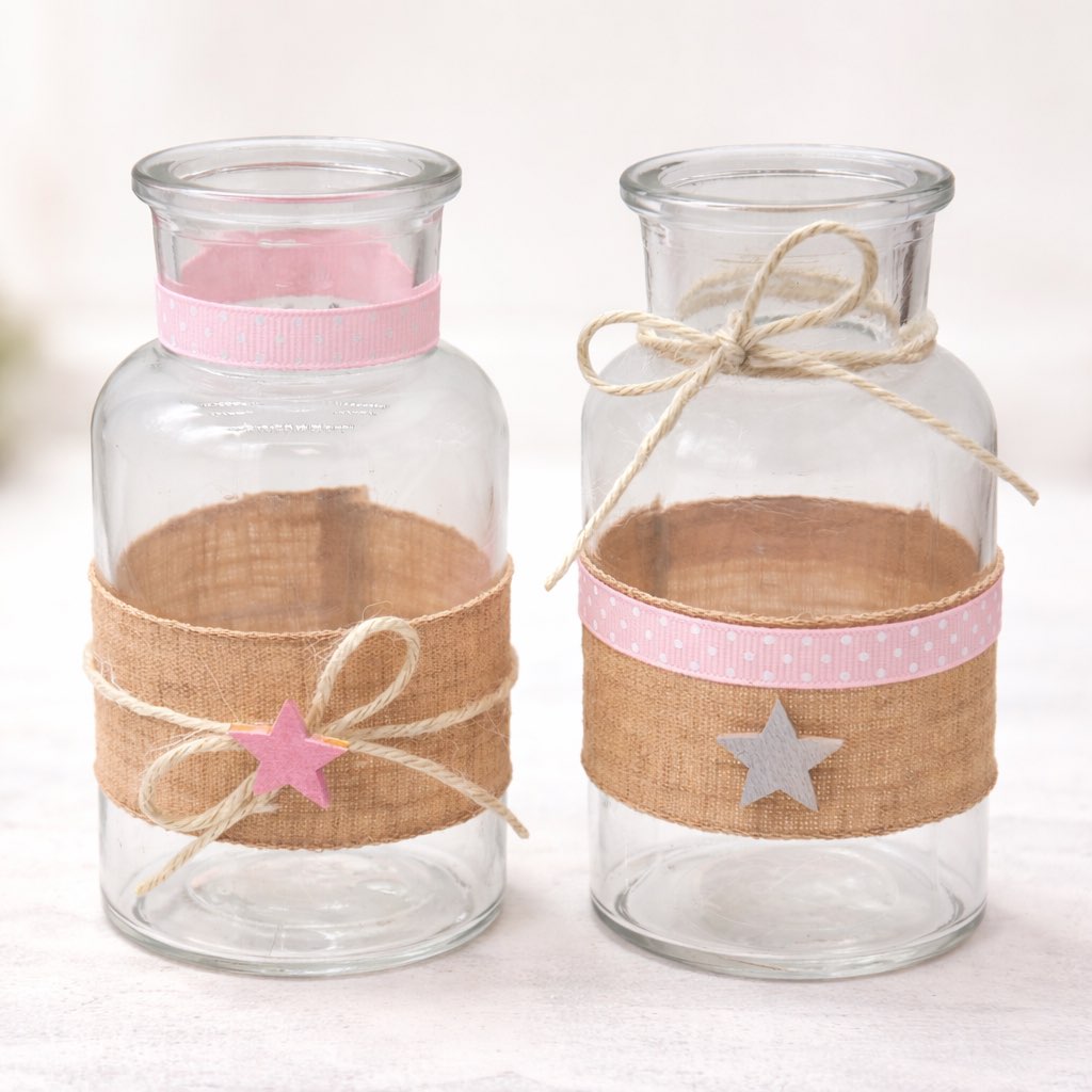 Jede Vase ist individuell verziert mit Leinenband, Punkteband, heller Naturkordel und einem dekorativen Holzstern – für eine warme, gemütliche Atmosphäre im Landhaus- oder Boho-Stil.