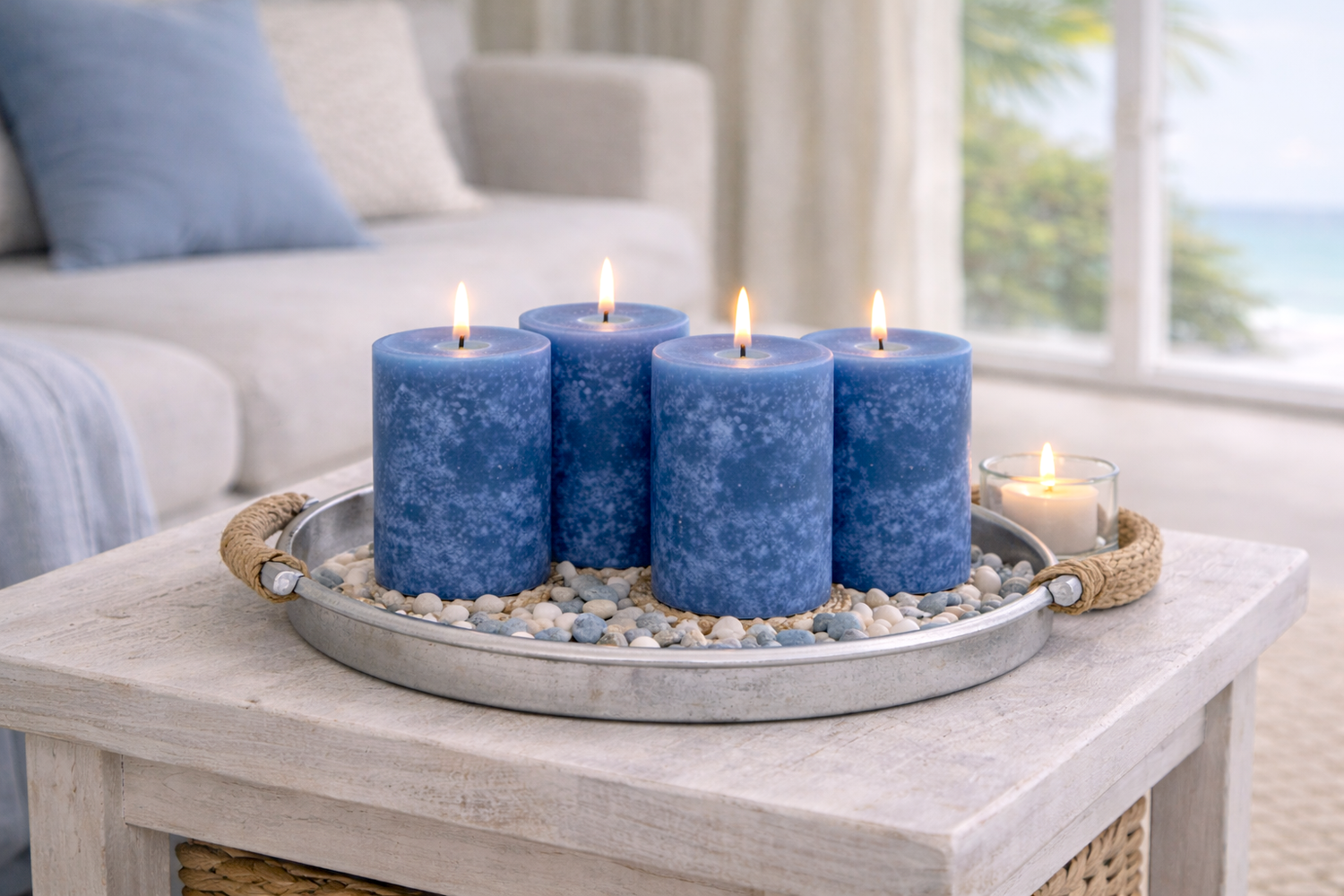 In einem eleganten Azurblau mit Marmorierung sind sie ein stilvoller Blickfang für jede Jahreszeit – ob als Maritime Sommer Tischdeko, im Adventskranz oder als Tischdekoration für Taufe oder Strandhochzeit.