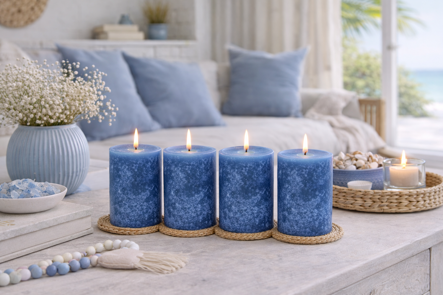 4er-Set Blaue Stumpenkerzen – Azurblau, leicht meliert, handgegossen aus deutscher Herstellung