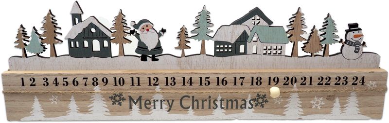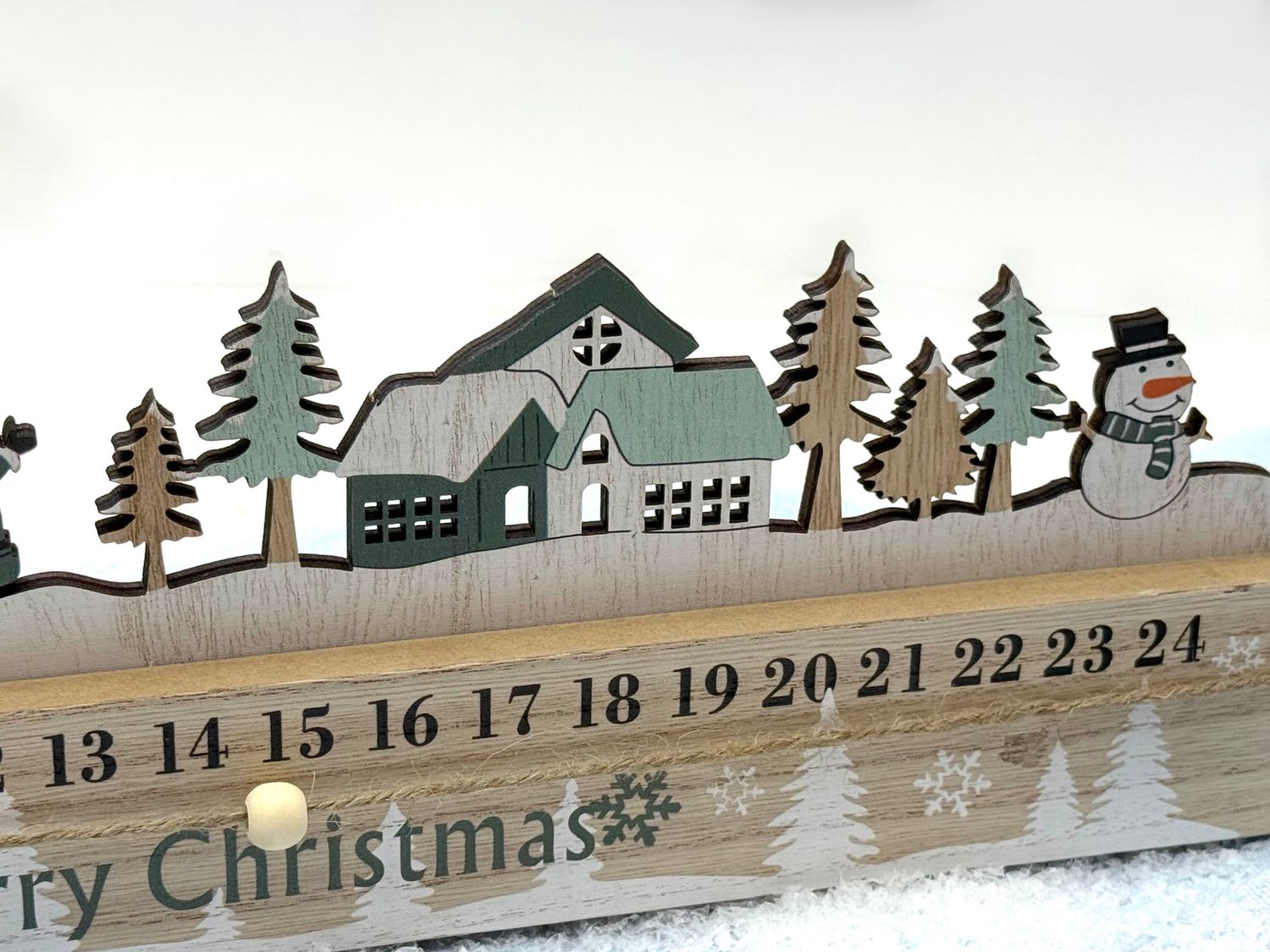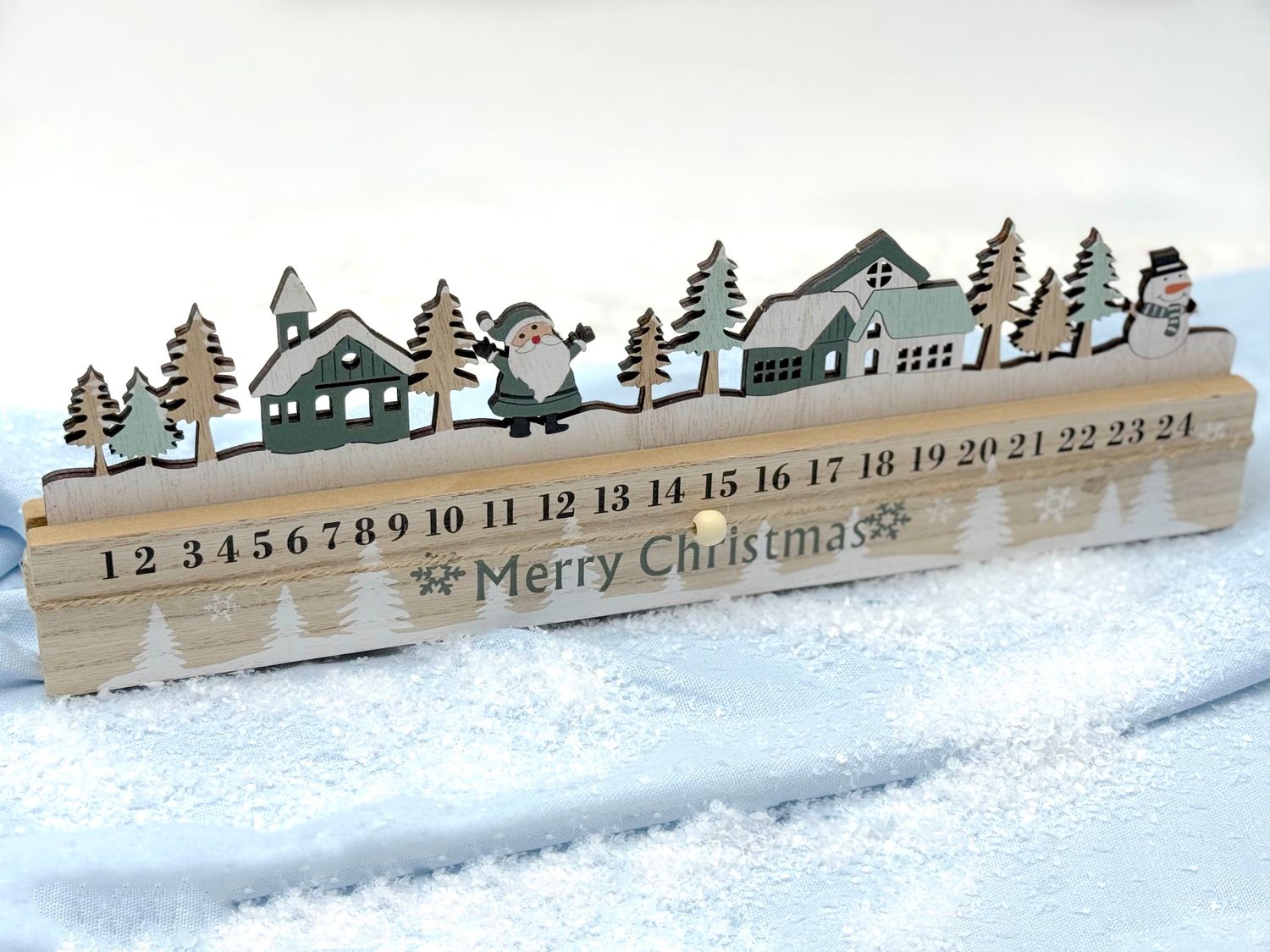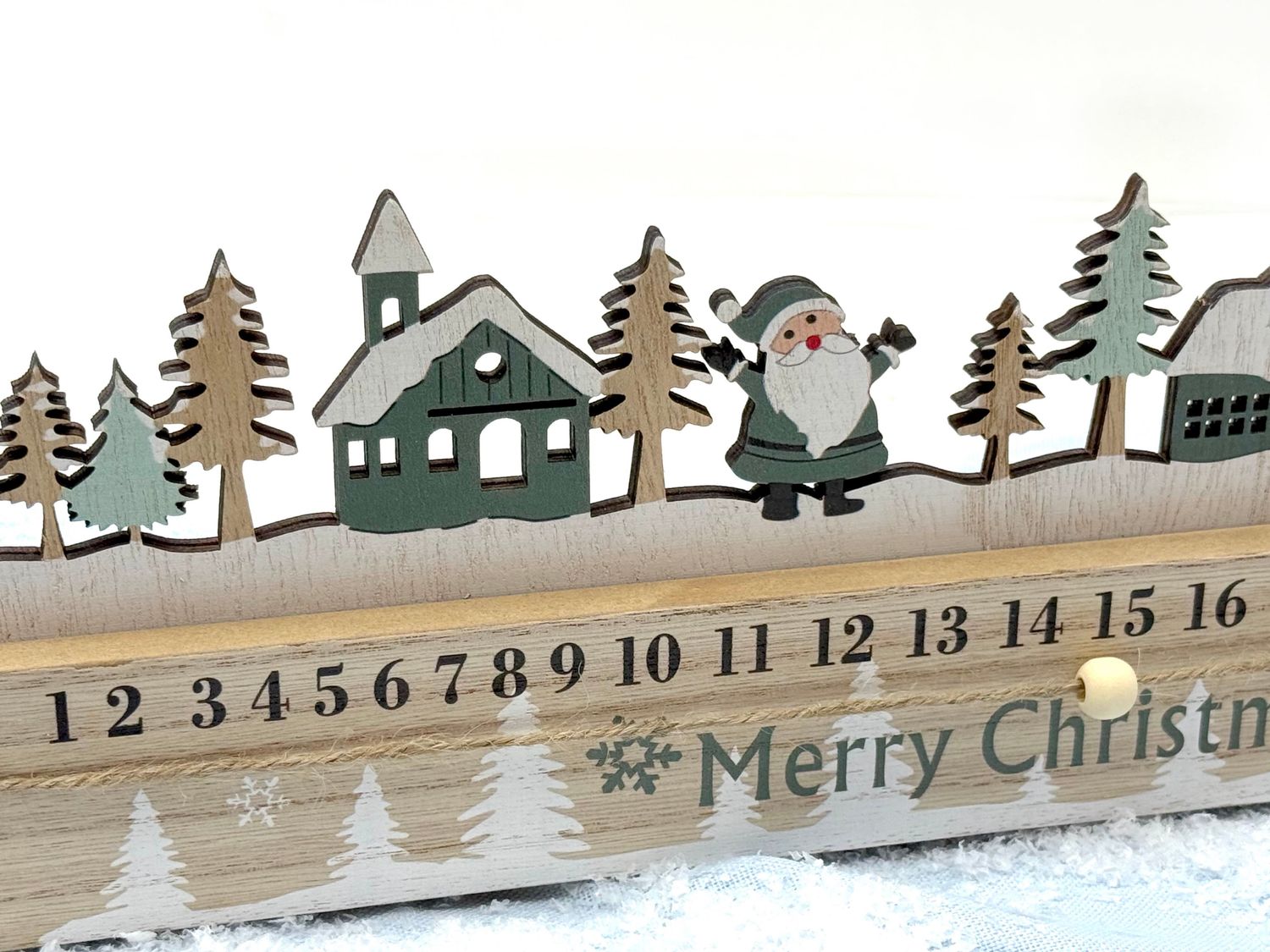 Der Kalender ist mit liebevoll gestalteten Holzfiguren (2D) dekoriert: Tannenbäume, Schneemann, Weihnachtsmann & Häusern - nachhaltig & wiederverwendbar.
