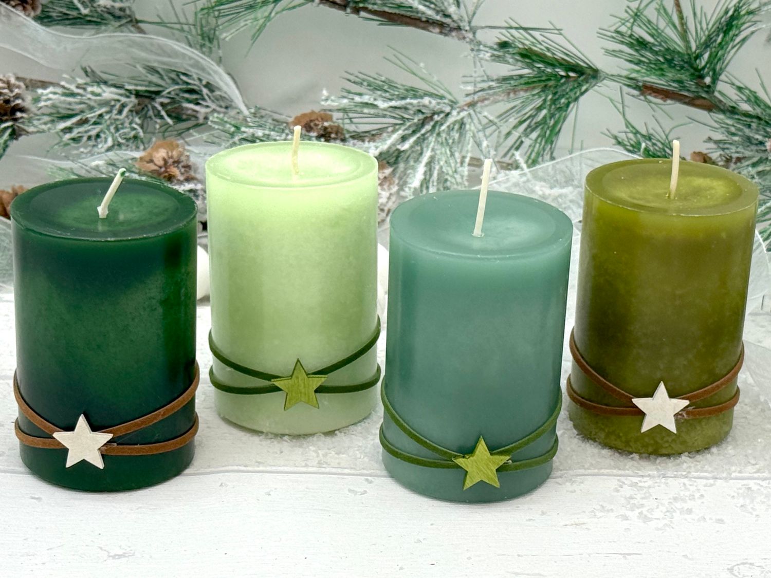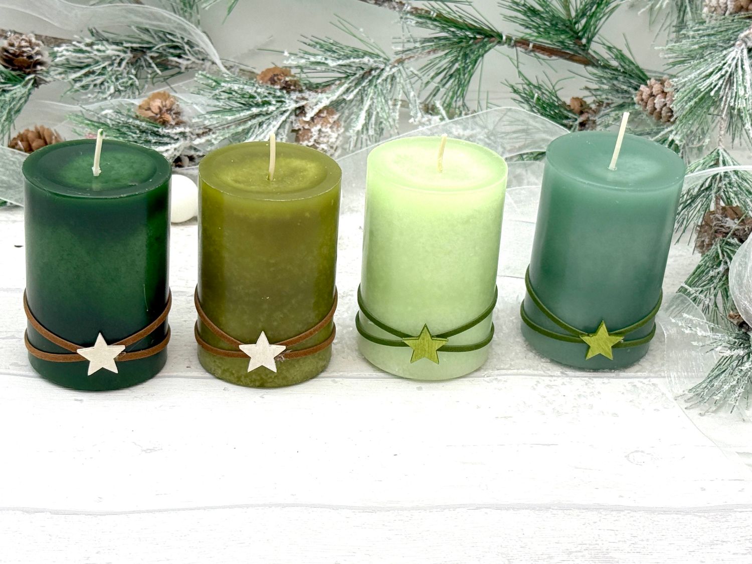 Vier Adventskerzen - Stumpenkerzen - Kerzen in Olive, Softgrün, Smaragd/Salbei, Jägergrün/Dunkelgrün , ohne Duft, leicht meliert, verziert mit einem Velourband in Braun oder Grün und einem Holzstern in Natur oder Grün.