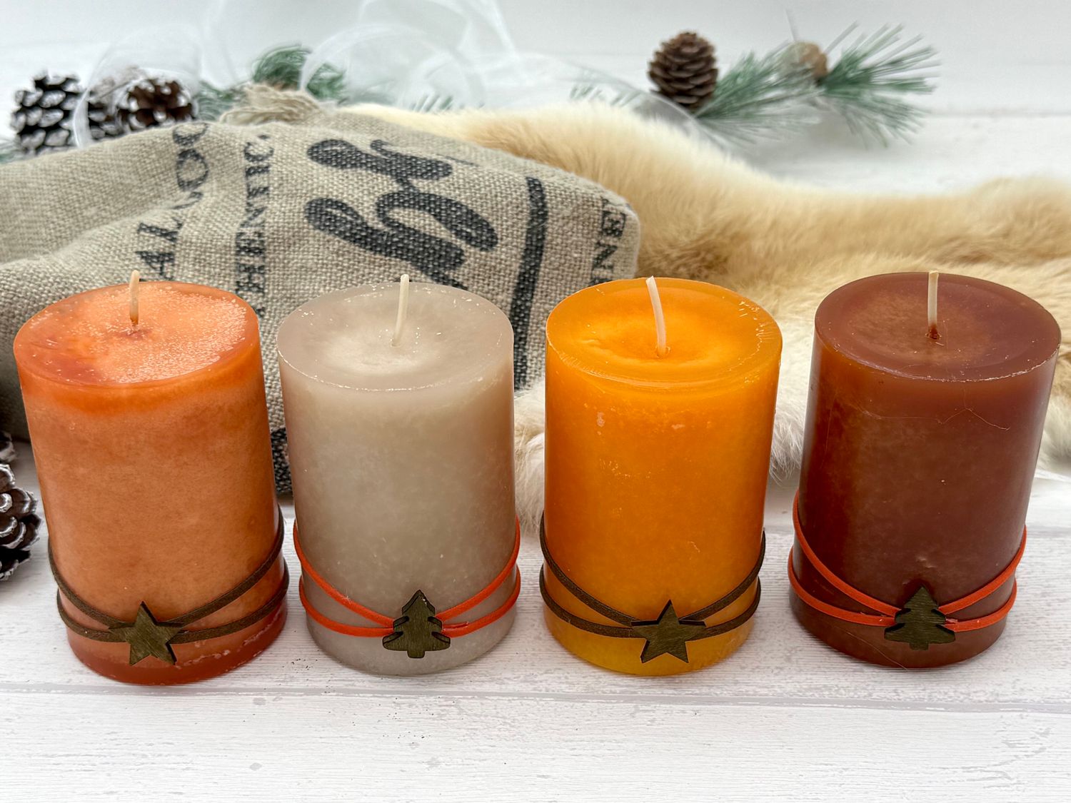 Die leicht melierte Oberfläche und die dezente Verzierung mit einem Velourband in Braun oder Orange sowie einem kleinen Holzanhänger in Form eines Baumes oder Sterns machen jede Kerze zu einem kleinen Kunstwerk.