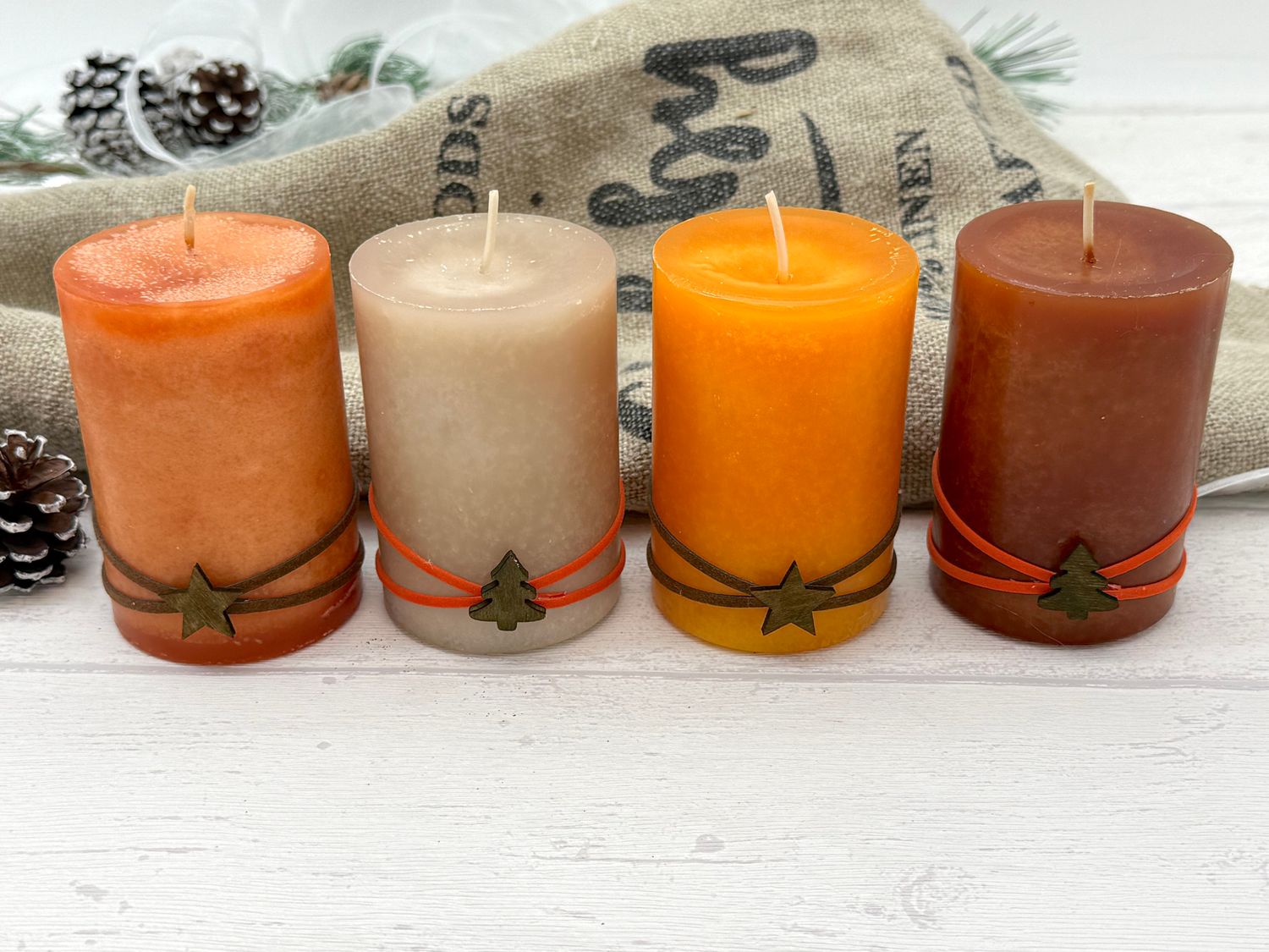 Vier Adventskerzen - Stumpenkerzen - Kerzen in Orange und Brauntönen ohne Duft, leicht meliert, verziert mit einem Velourband in Braun oder Orange und einem Holzbaum oder Stern in Braun.