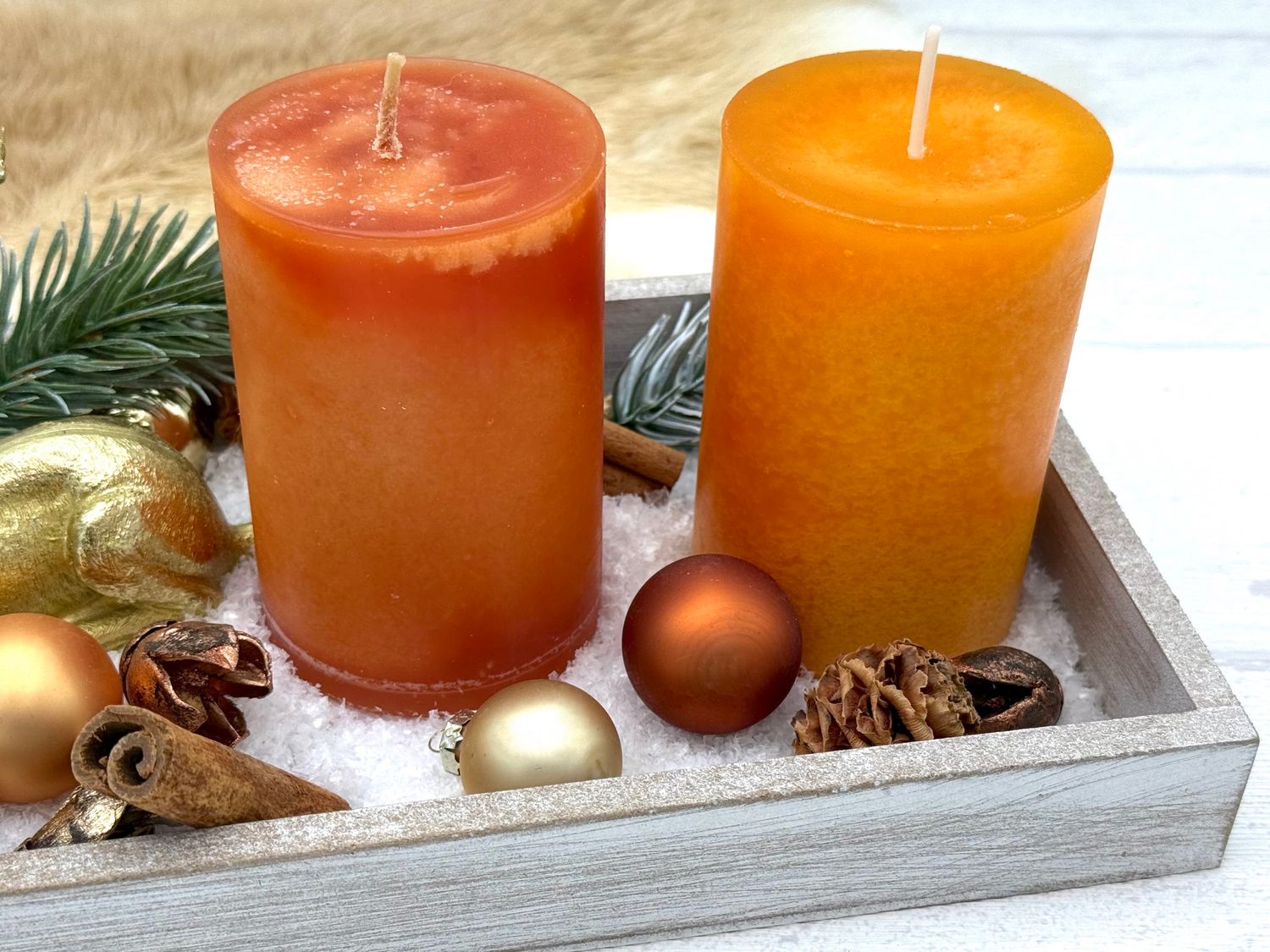 Zwischen den Kerzen und goldenen Hirsch verteilt sich die Streudeko, die aus Kunstschnee, Tannenzweigen künst. Zimtstangen, Zapfen und funkelnden Glaskugeln in Kupfer, Orange und Gold besteht.