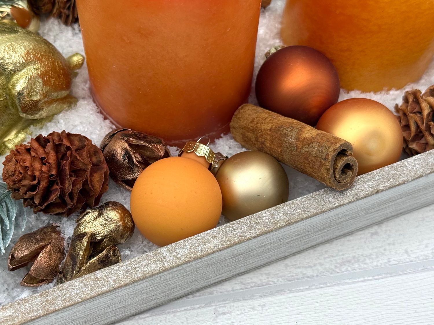 Streudeko bestehend aus Glaskugeln in Kupfer, Gold und Orange, Zapfen, Zimtstangen, künst. Tannenzweigen und Kunstschnee.