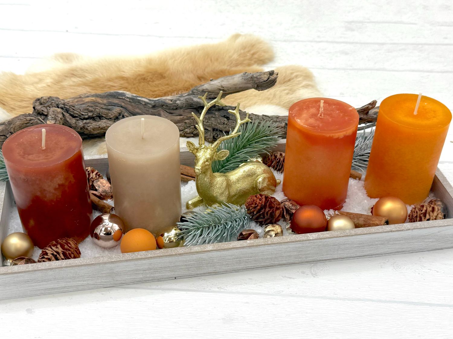 Ein graues Tablett aus Holz mit vier Stumpenkerzen in Farben Marone/Braun/Orange/Beige sowie einem goldenen Hirsch Figur und Streudeko