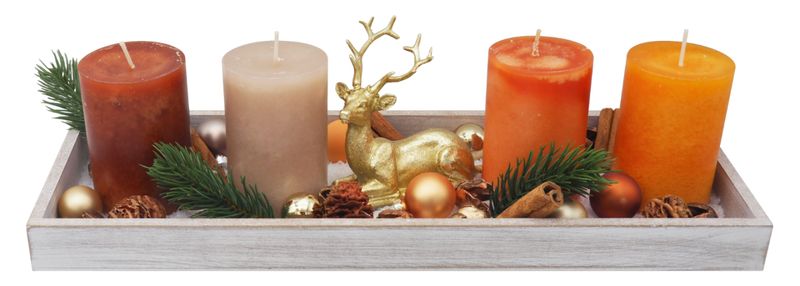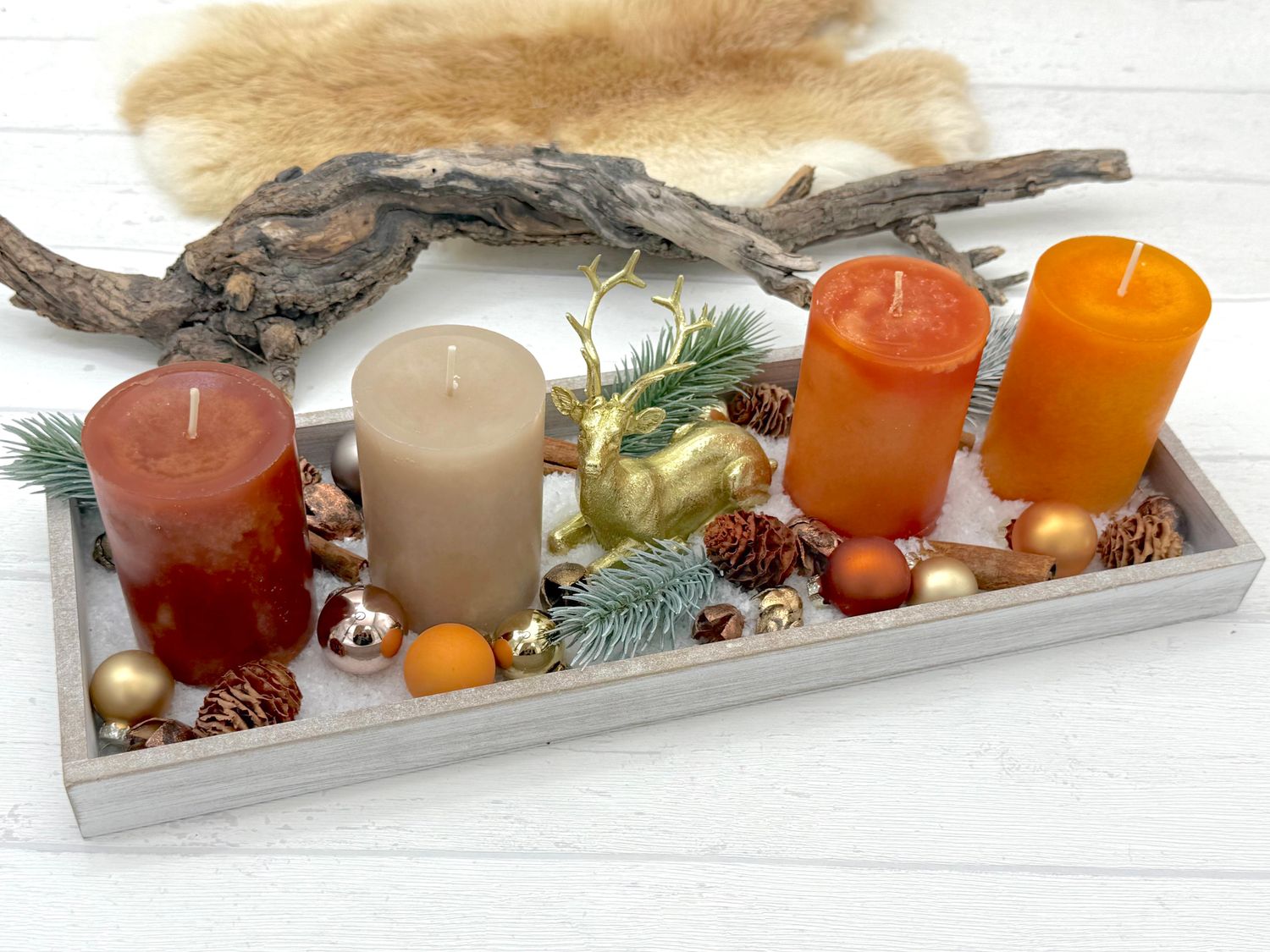 Ein Holztablett gestaltet als modernes Adventsgesteck für Weihnachten, mit Marone, Orangefarbenen und Sahara-Beige Kerze sowie Hirsch in Gold