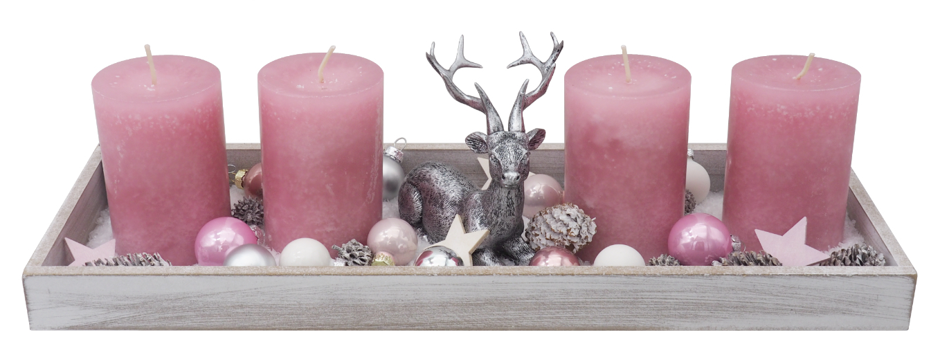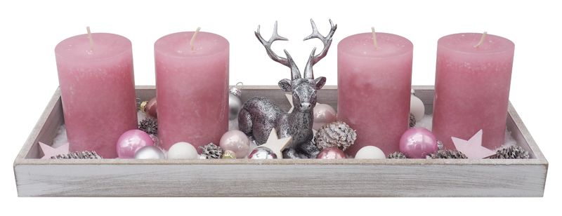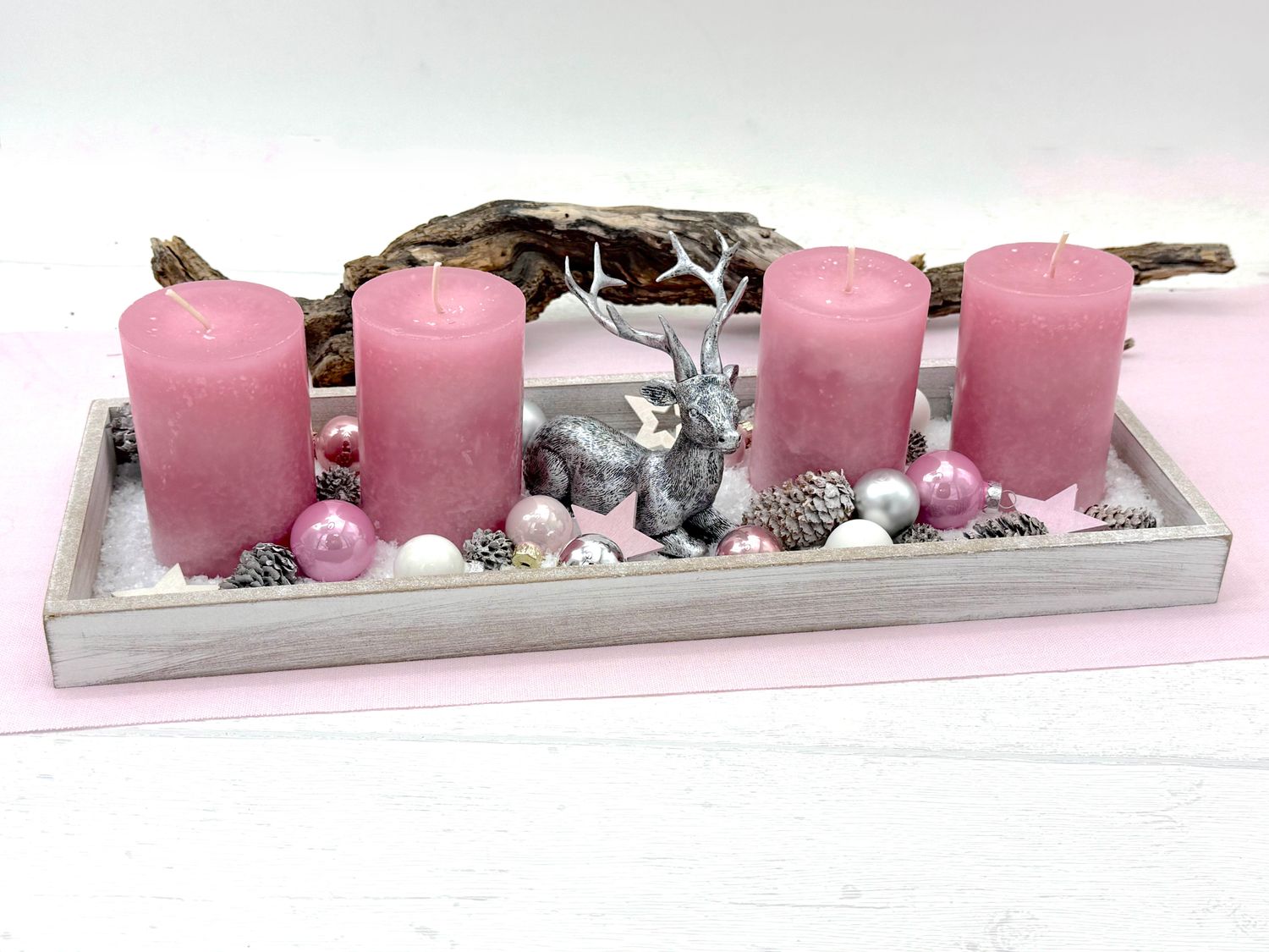 Adventstablett in Grau mit Hirsch, 4 Adventskerzen - Stumpenkerzen in Rosa & Streudeko auf grau gewischtem Holztablett