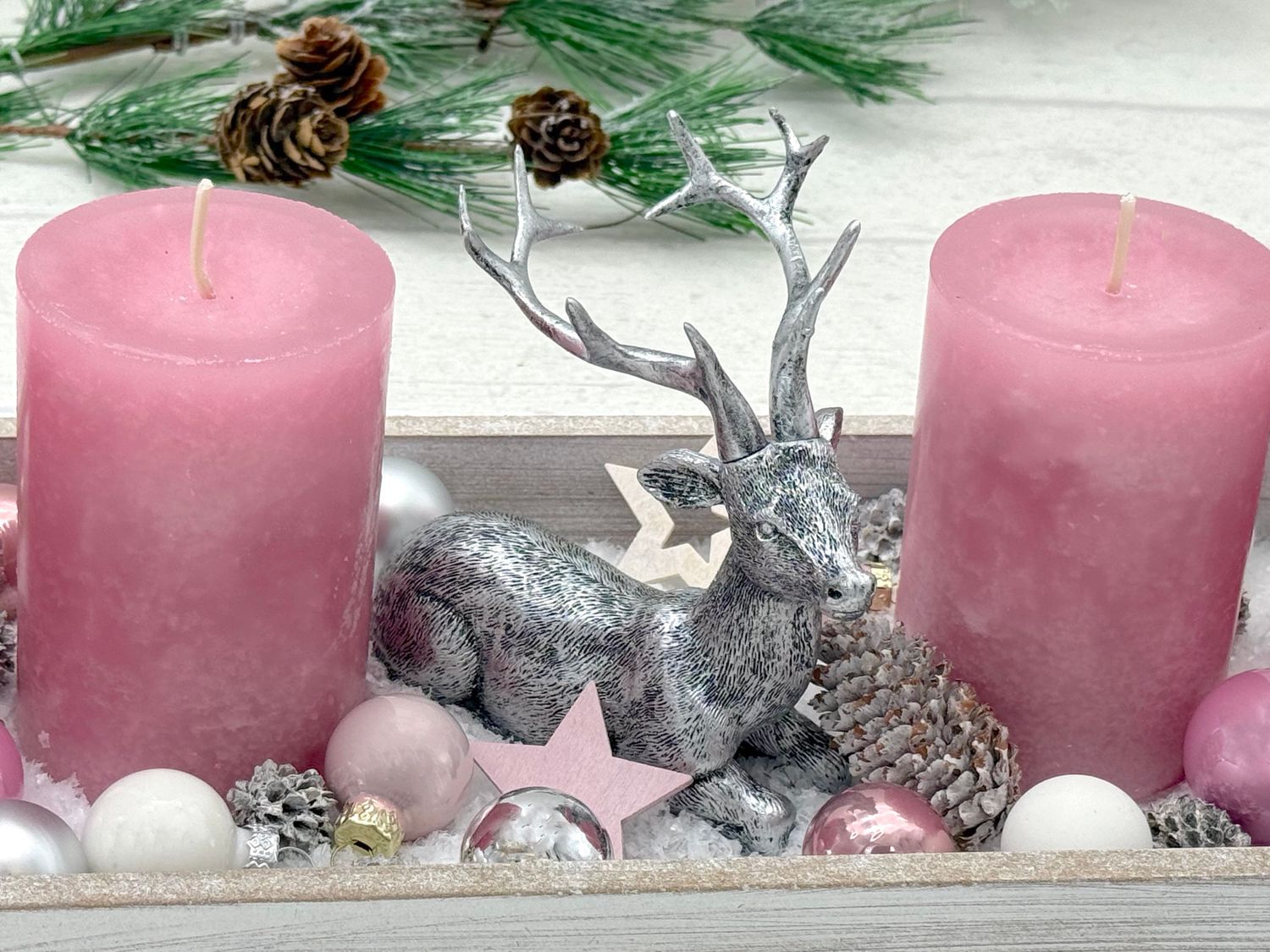 Ein grau gewischtes Tablett aus Holz mit vier Stumpenkerzen in Rosa, einem liegenden silbernen Hirsch aus Polyresin, sowie Streudeko