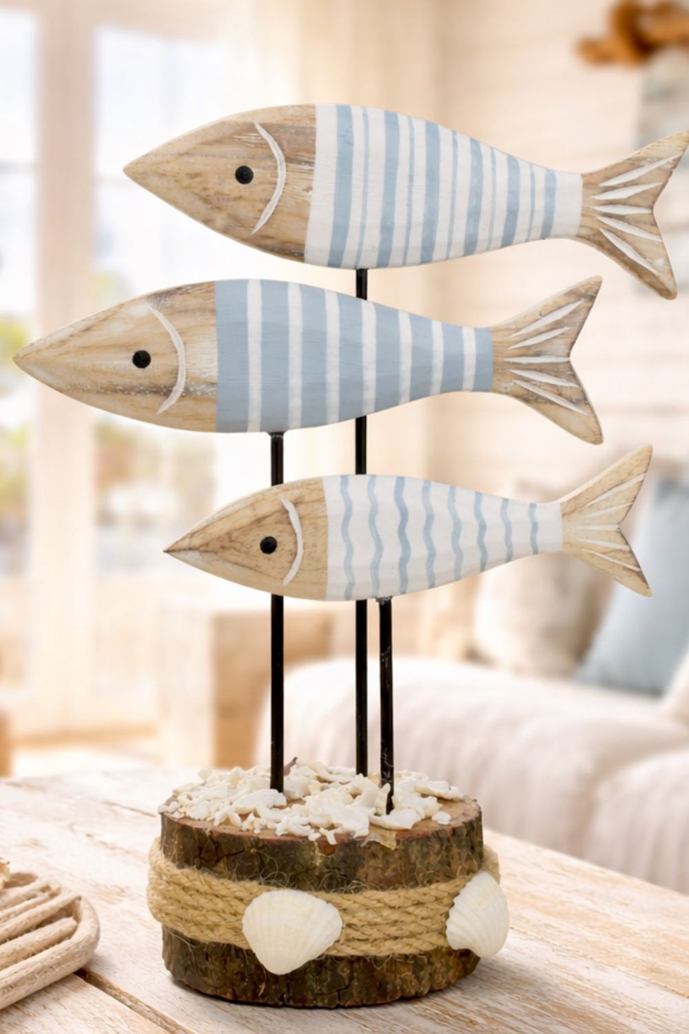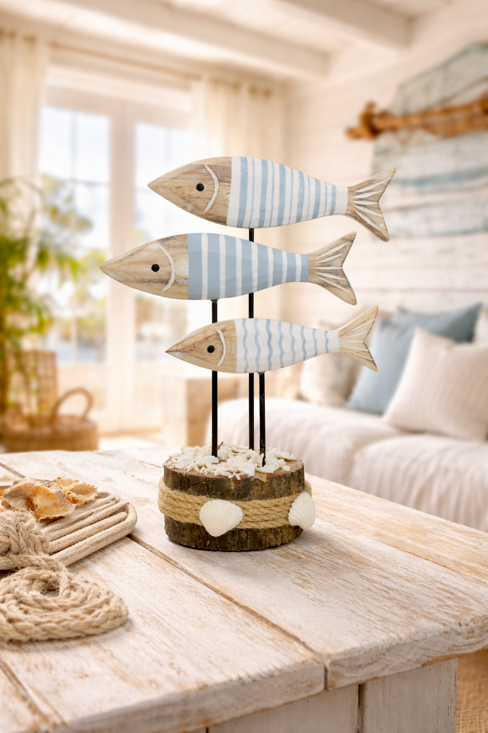 Maritimer Deko Aufsteller Fische aus Holz auf Baumstamm – Küsten-Dekoration in Natur, Weiß & Blau