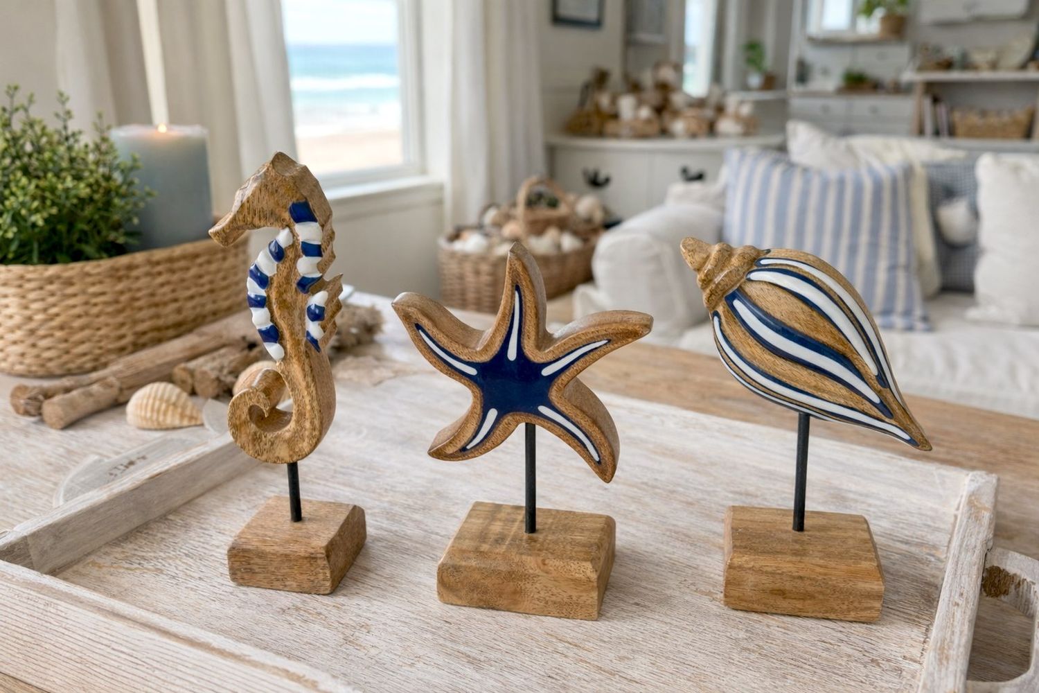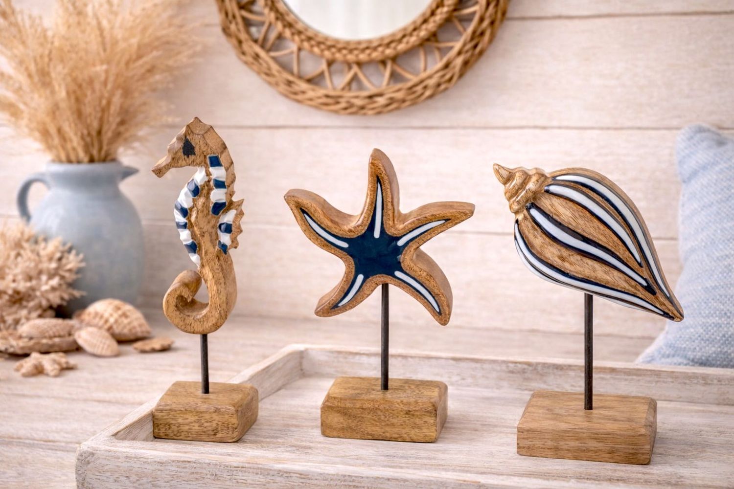 Maritimer Deko-Aufsteller aus Mangoholz – Seepferd, Seestern oder Muschel in Natur, Blau, Weiß