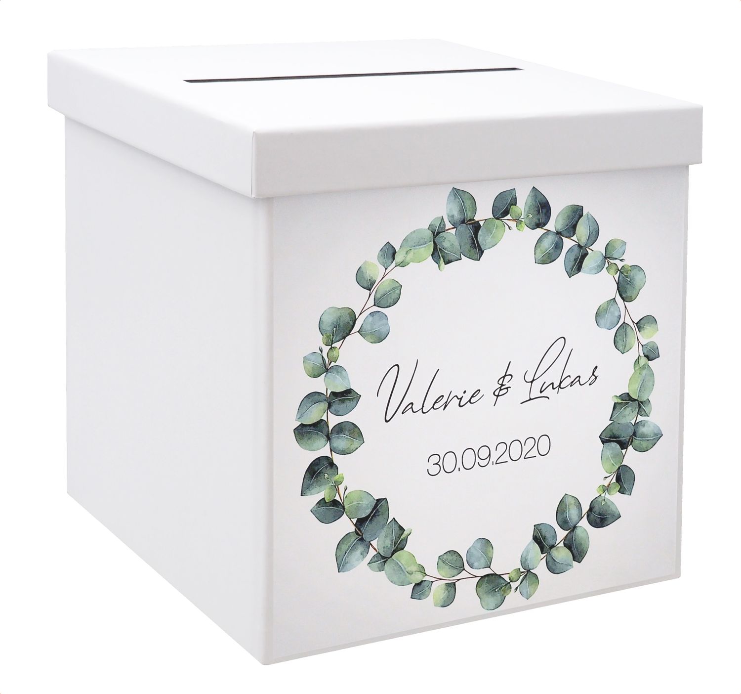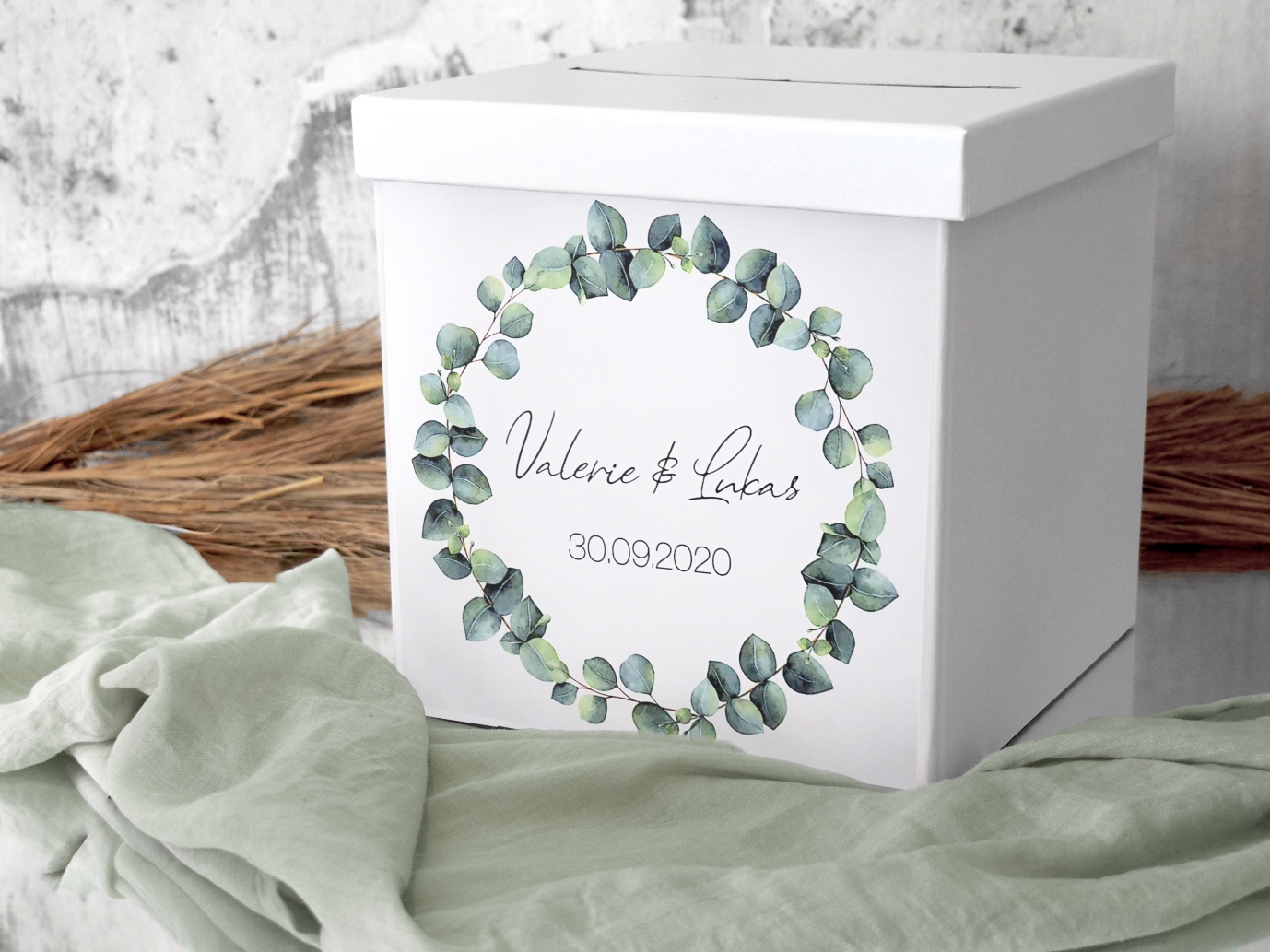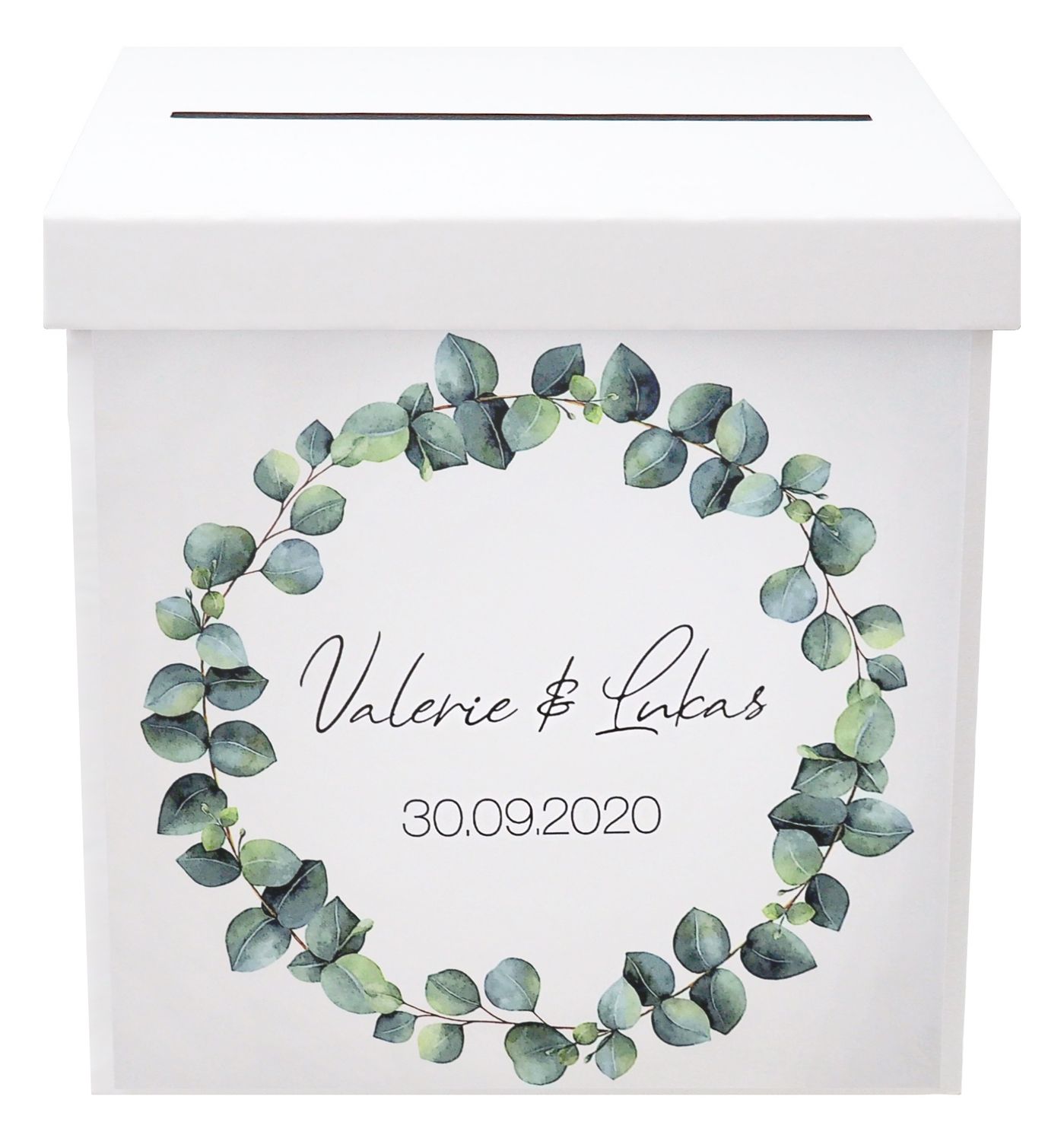 Personalisierte Briefbox -Geschenkbox mit Eukalyptus-Kranz - ideal für Hochzeit oder Verlobung