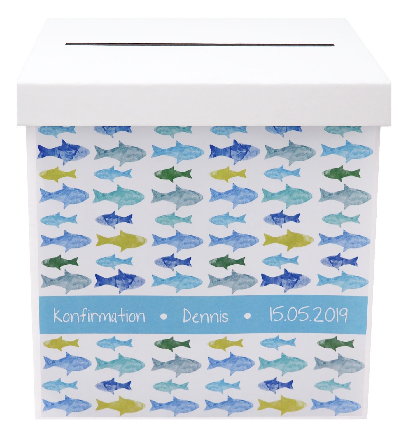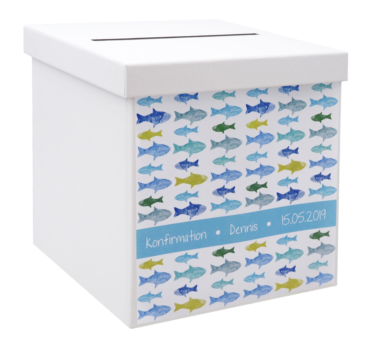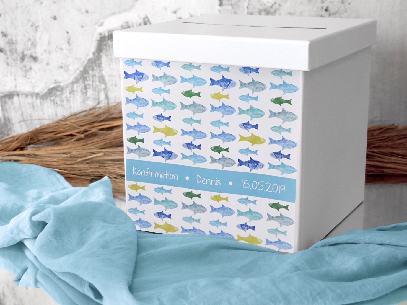 Diese Geschenkbox - Kartenbox in Weiß mit personalisiertem Fische Sticker ist die ideale Lösung für christliche Anlässe oder maritime Geburtstage.