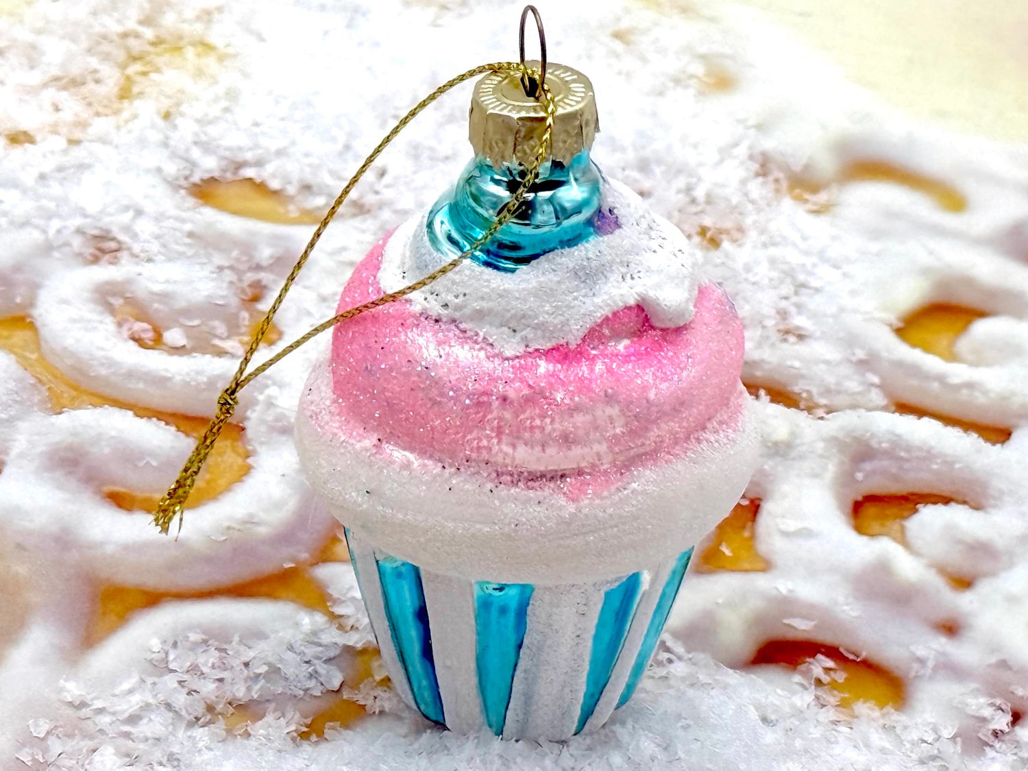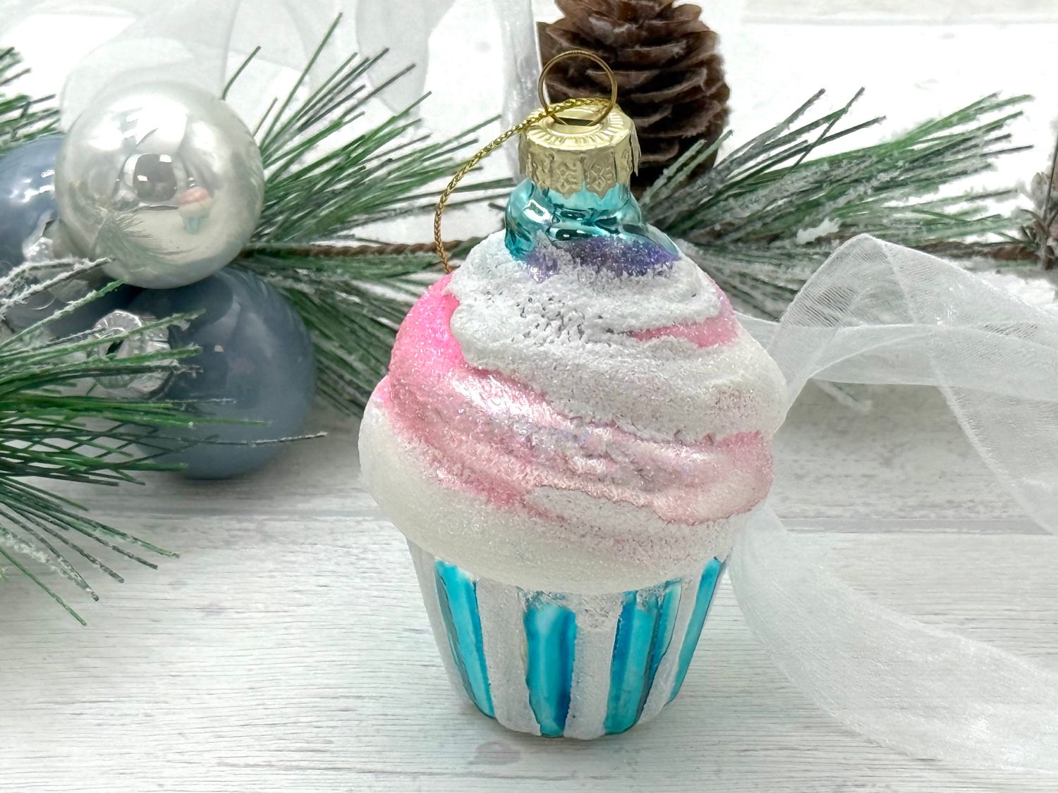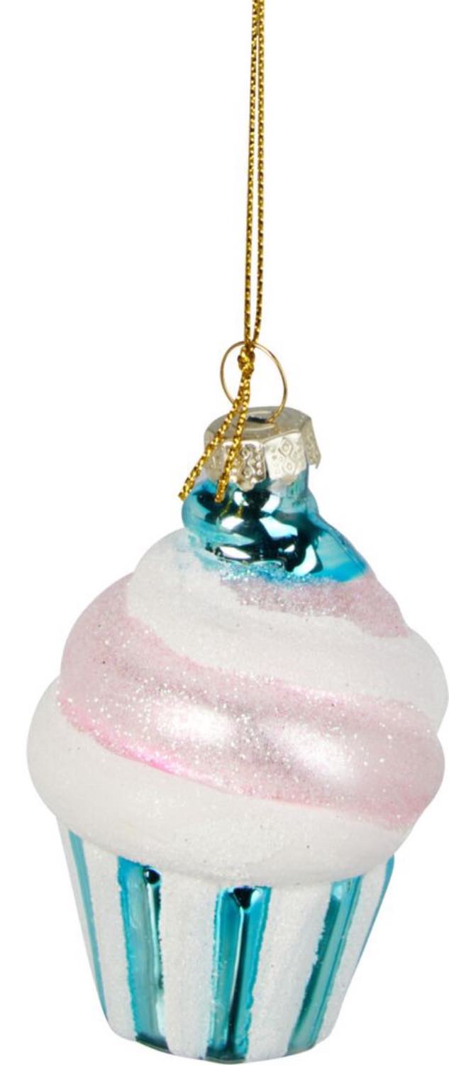 Glitzernder Cupcake Christbaumschmuck aus Glas in Türkis