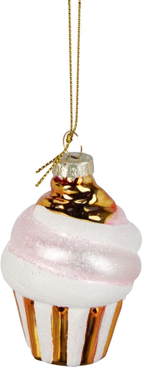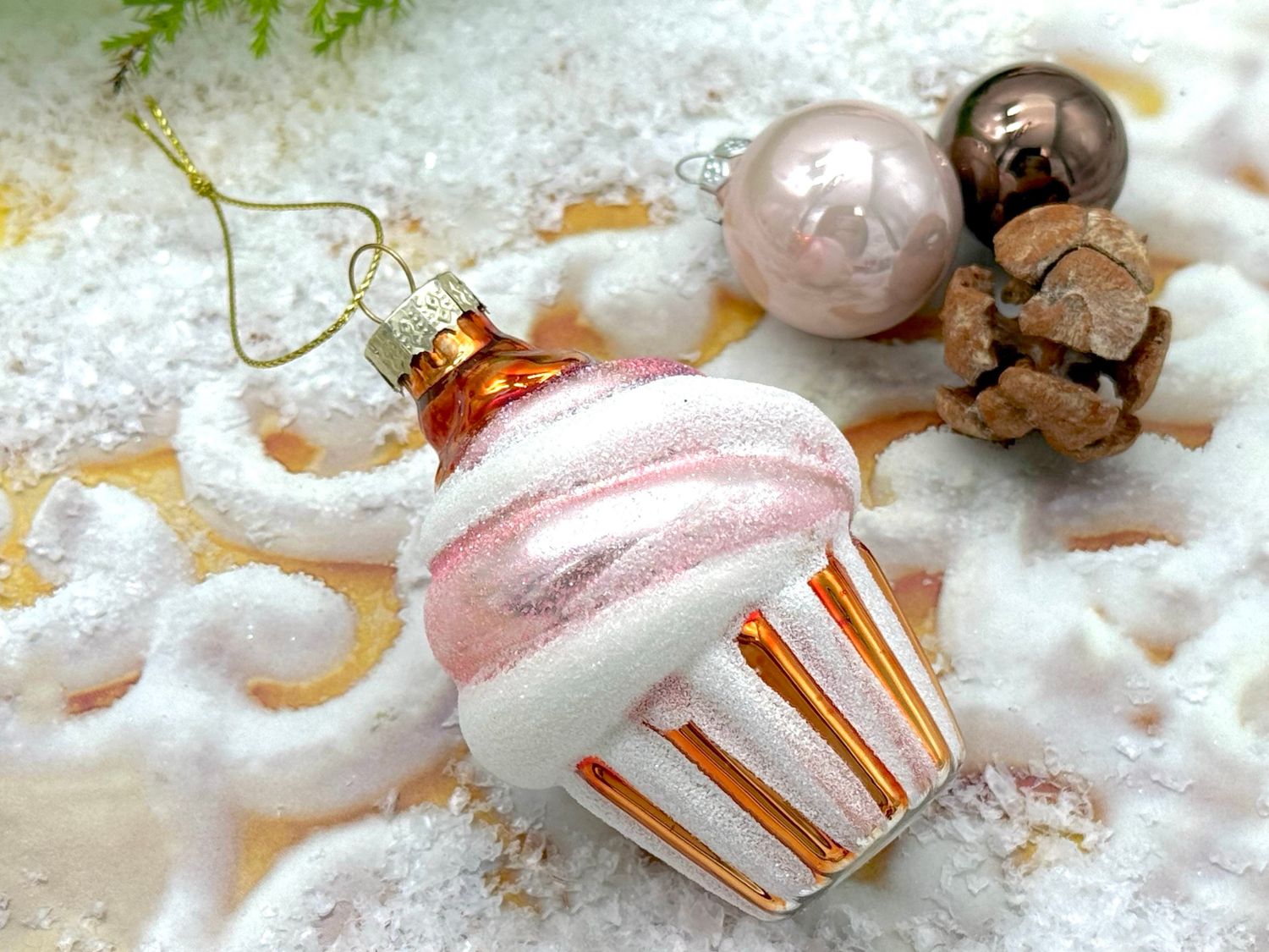 Ein Christbaumschmuck Cupcake - Muffin aus Glas mit Glitzer, handbemalt und detailreich