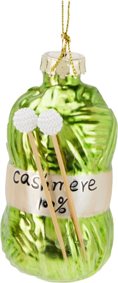 Eine stilvolle Kaschmirwolle aus Glas als Christbaumschmuck in Grün mit zwei Stricknadeln aus Holz & Velourband zum aufhängen.