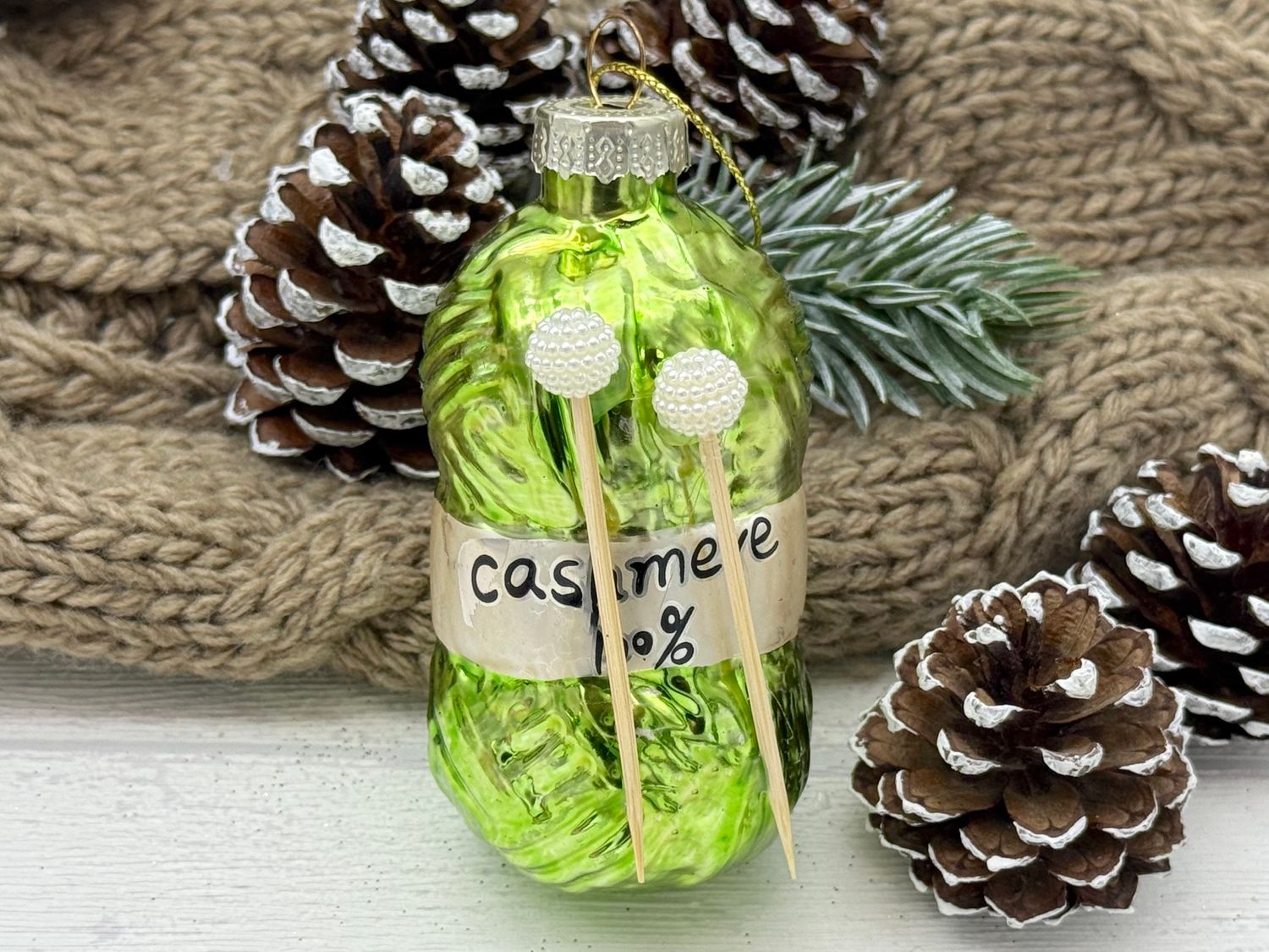Origineller Christbaumschmuck für Strickfans – Grün Strickwolle aus Glas mit Holz-Stricknadeln