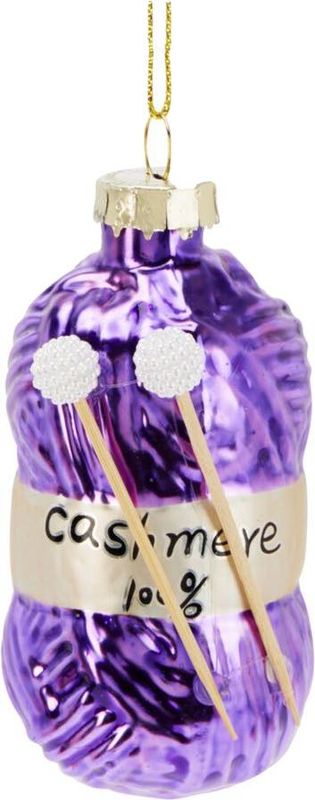 Eine stilvolle Kaschmirwolle aus Glas als Christbaumschmuck in Lila mit zwei Stricknadeln aus Holz & Velourband zum aufhängen.