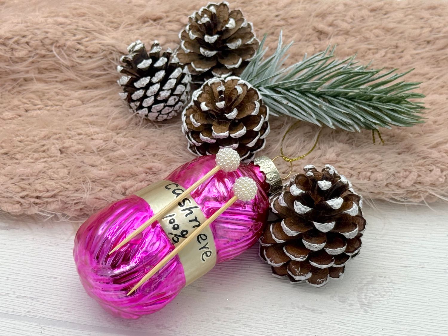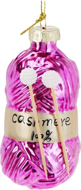 Eine stilvolle Kaschmir Wolle aus Glas als Christbaumschmuck in Pink mit zwei Stricknadeln aus Holz & zum aufhängen.