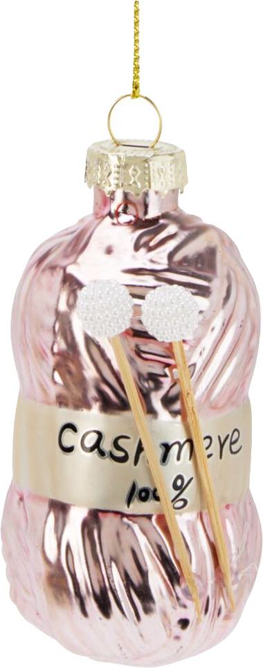 Eine stilvolle Kaschmir Wolle aus Glas als Christbaumschmuck in Pink mit zwei Stricknadeln aus Holz & zum aufhängen.