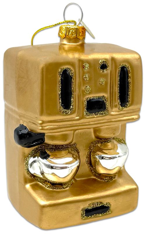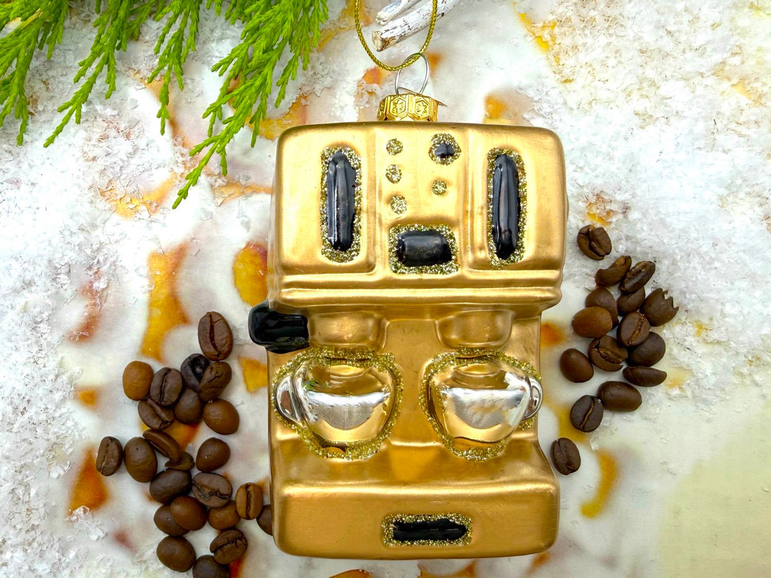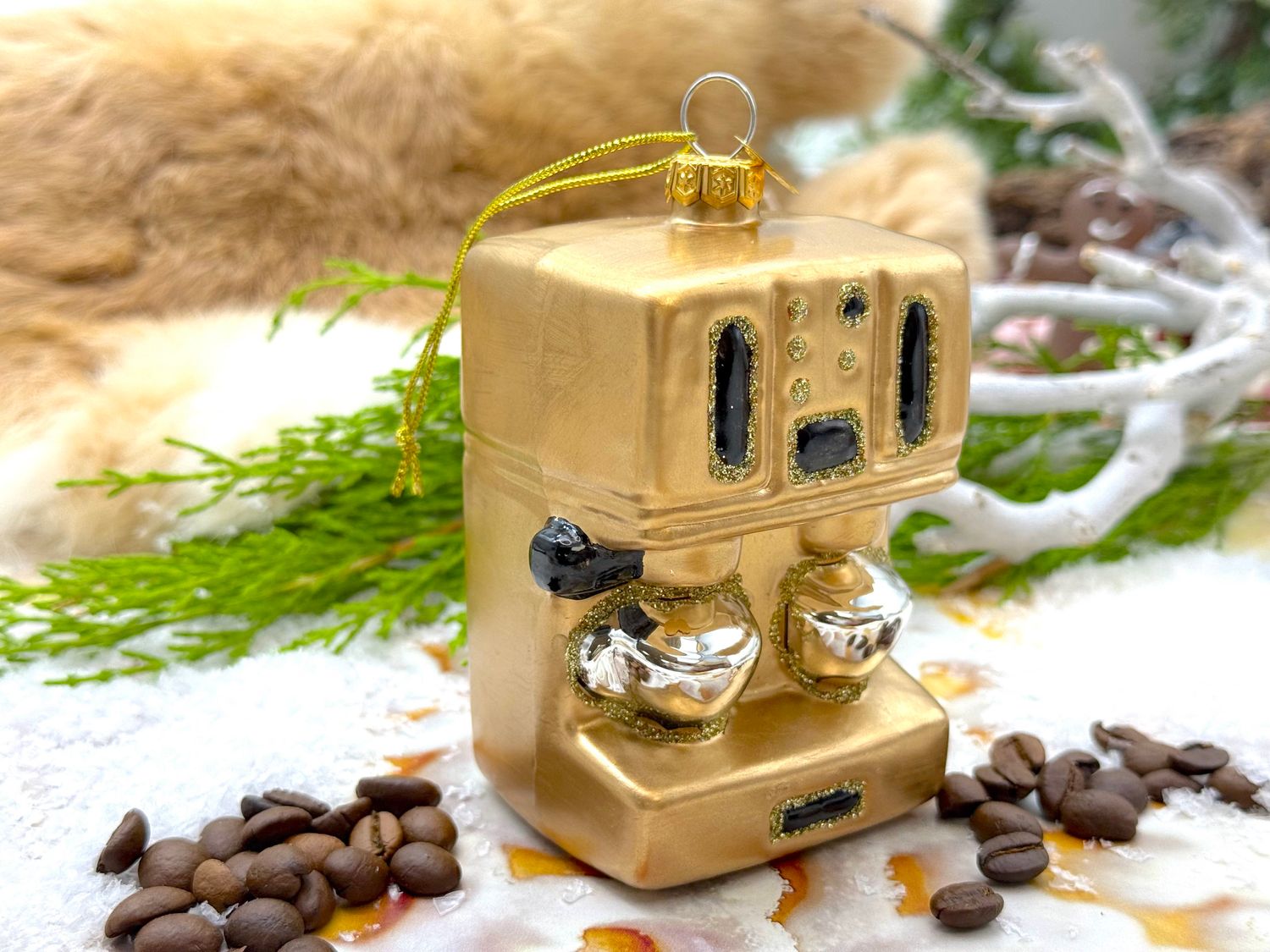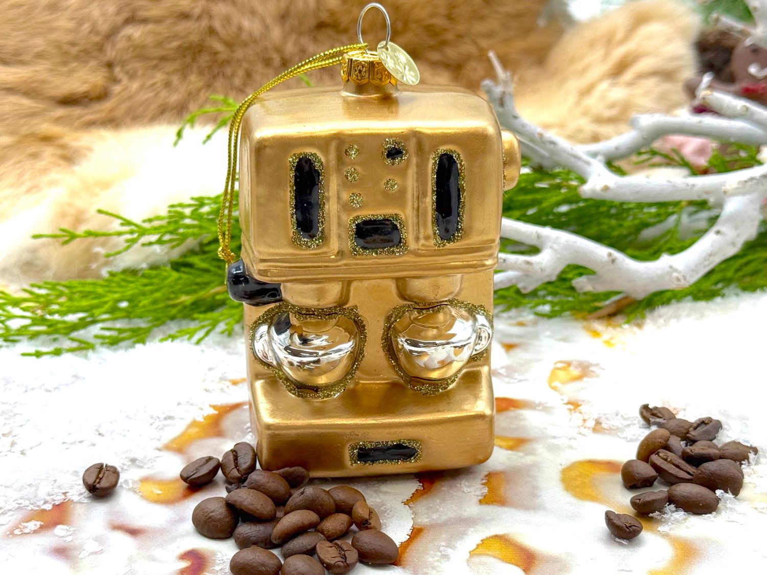 Eine Kaffeemaschine als Christbaumschmuck, hochwertig gearbeitet, detailreich & glitzernd