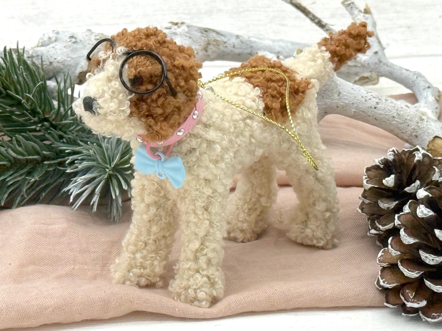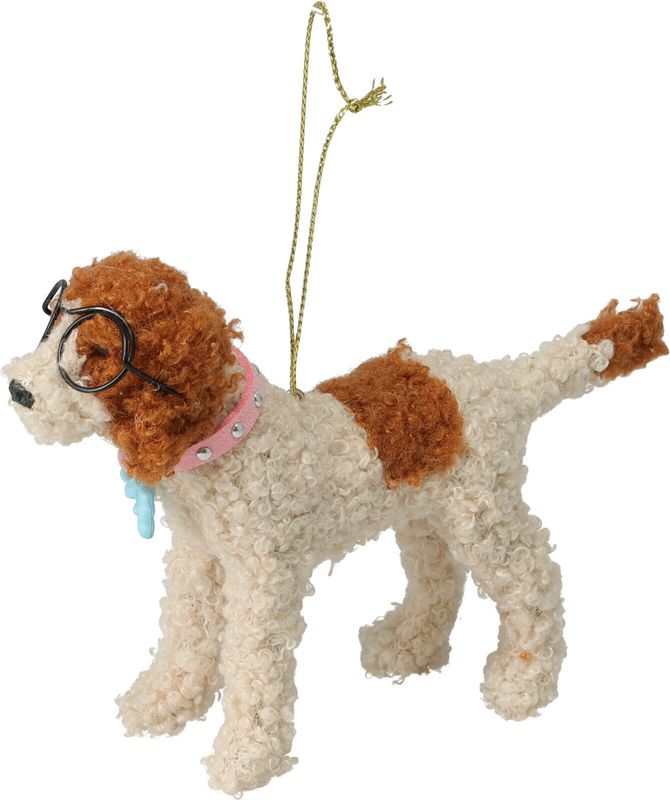 Ein Hund - Labradoodle als Christbaumschmuck in Beige mit braunen Flecken, mit schwarzer Brille und Rosa Halsband mit hellblauer Schleife