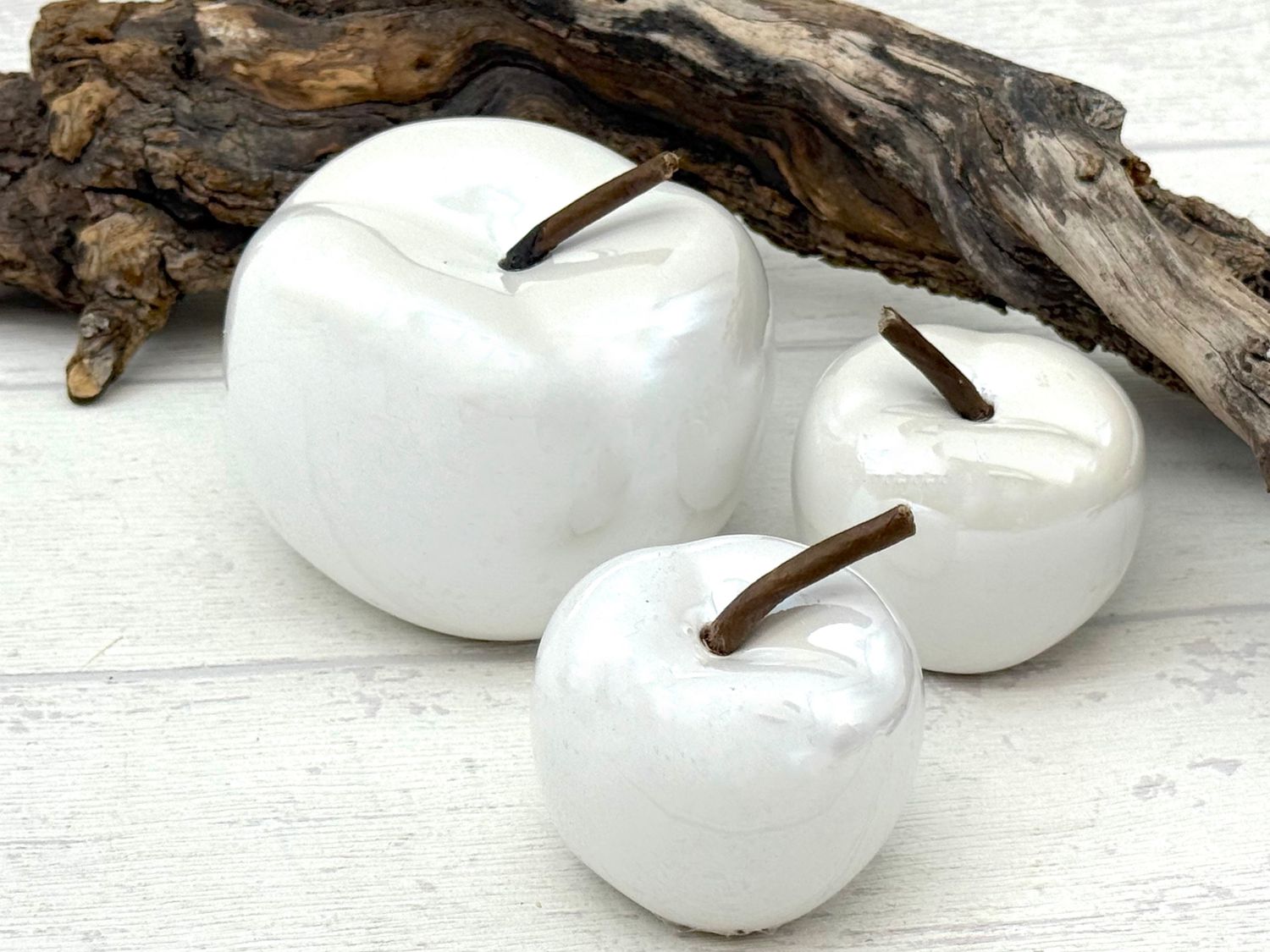Drei Hochwertige Keramik-Äpfel in Perlmutt Weiß mit glänzender Lasur und edlem Perleffekt - schillernden, changierenden Glanz