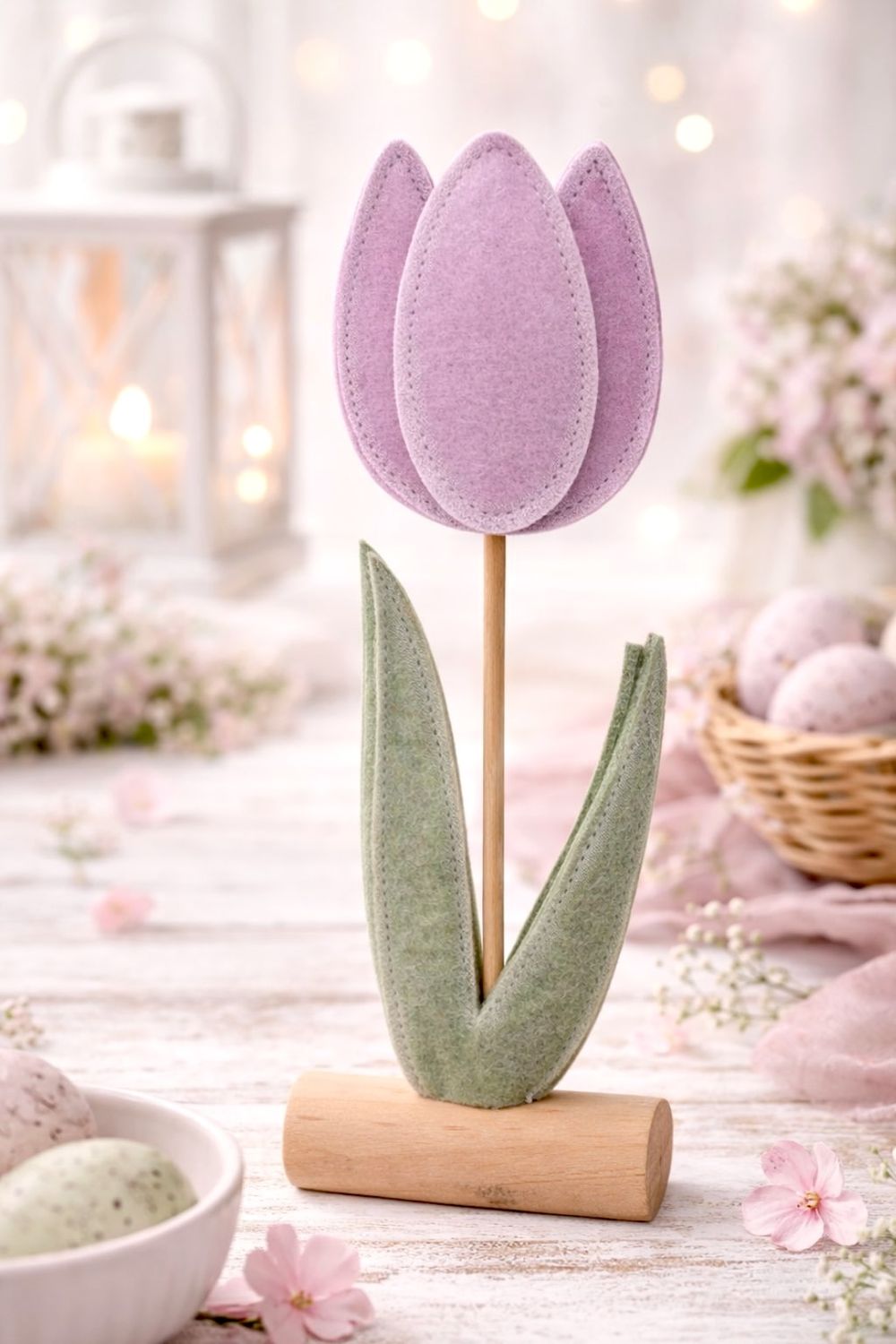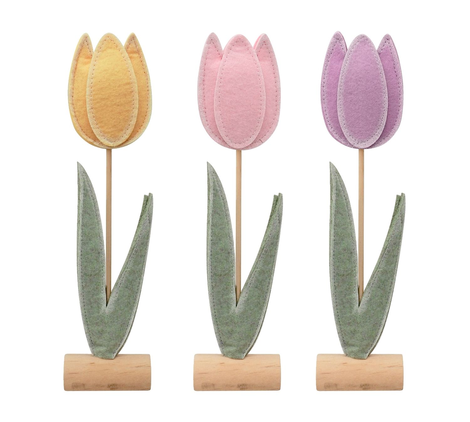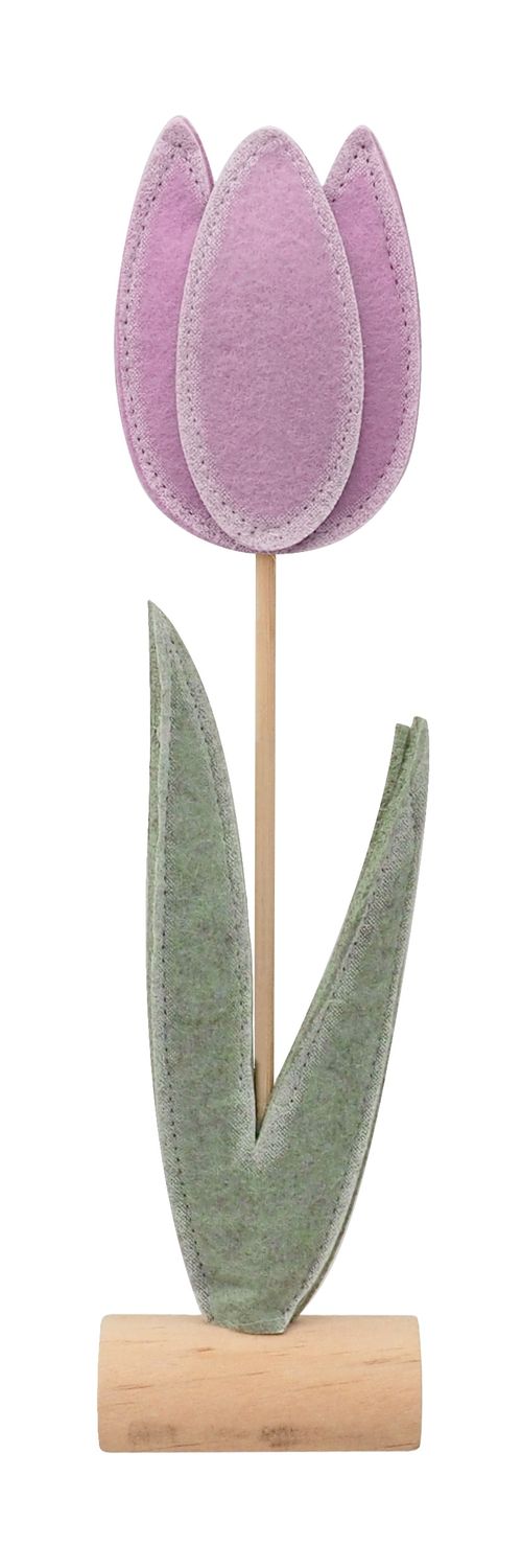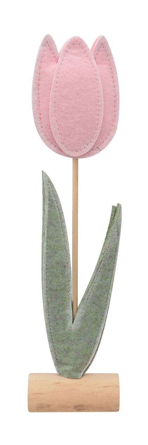 Der dekorative Aufsteller kombiniert eine zarte Tulpenblüte aus hochwertigem Filz mit einem stabilen Holzstiel und passendem Standfuß.