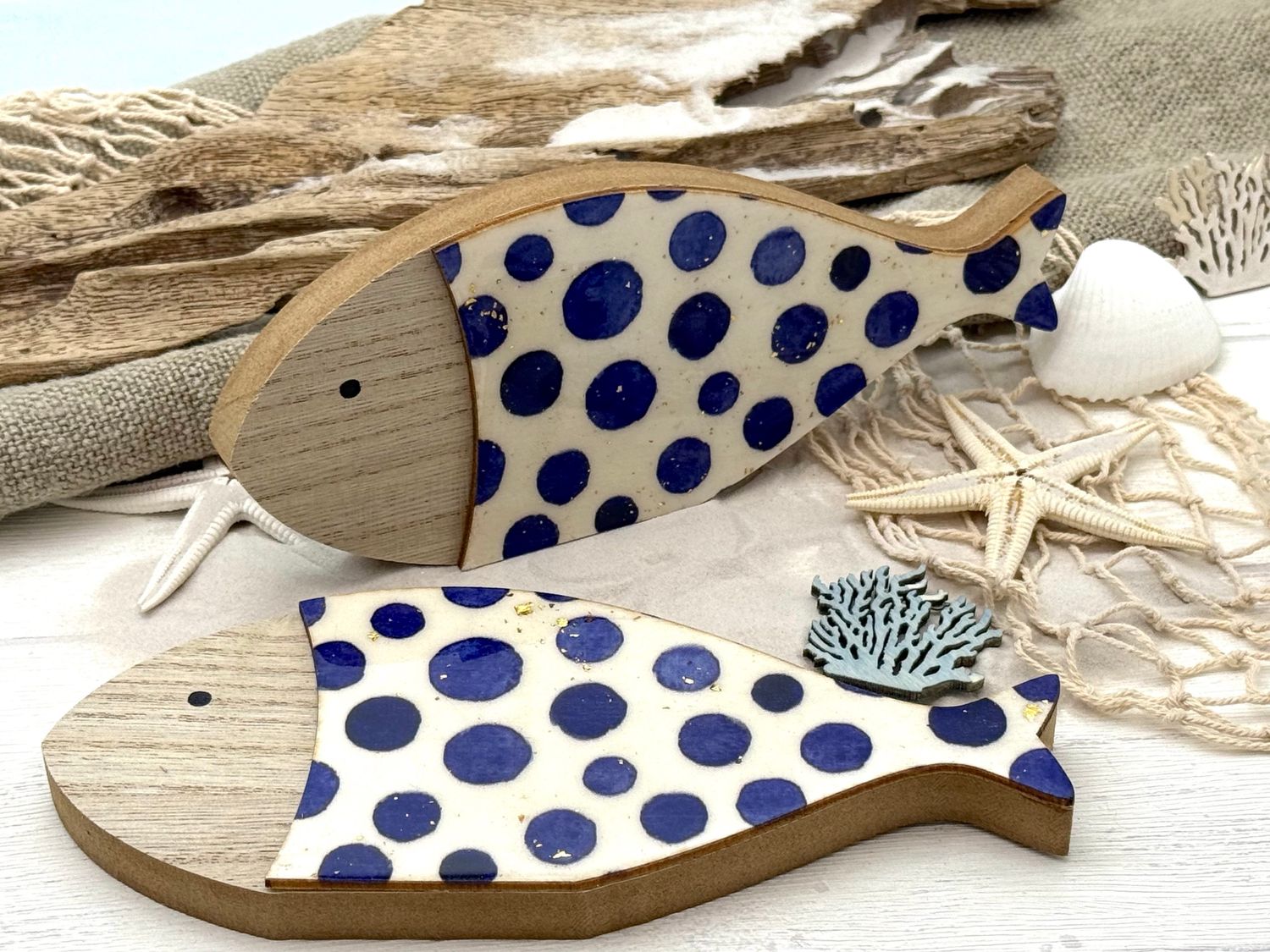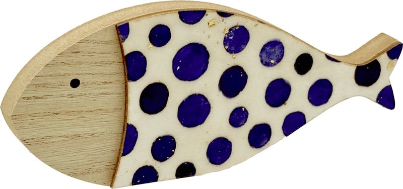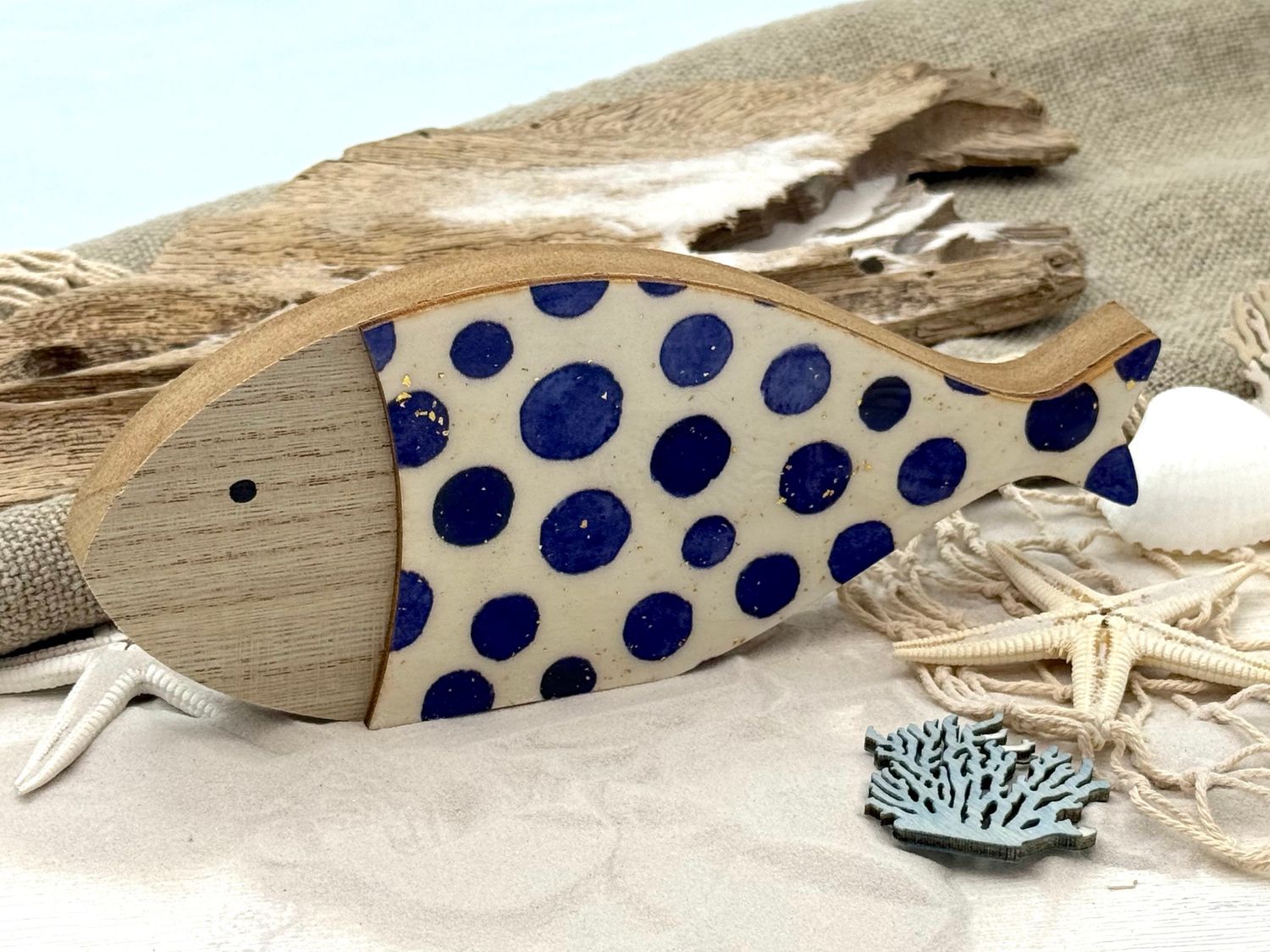 Maritimer Deko Fisch aus Holz zum Hinstellen – handbemalt mit blauen Punkten und Goldglitzer