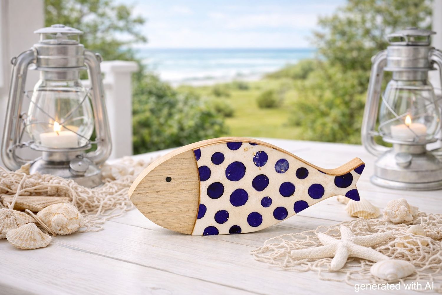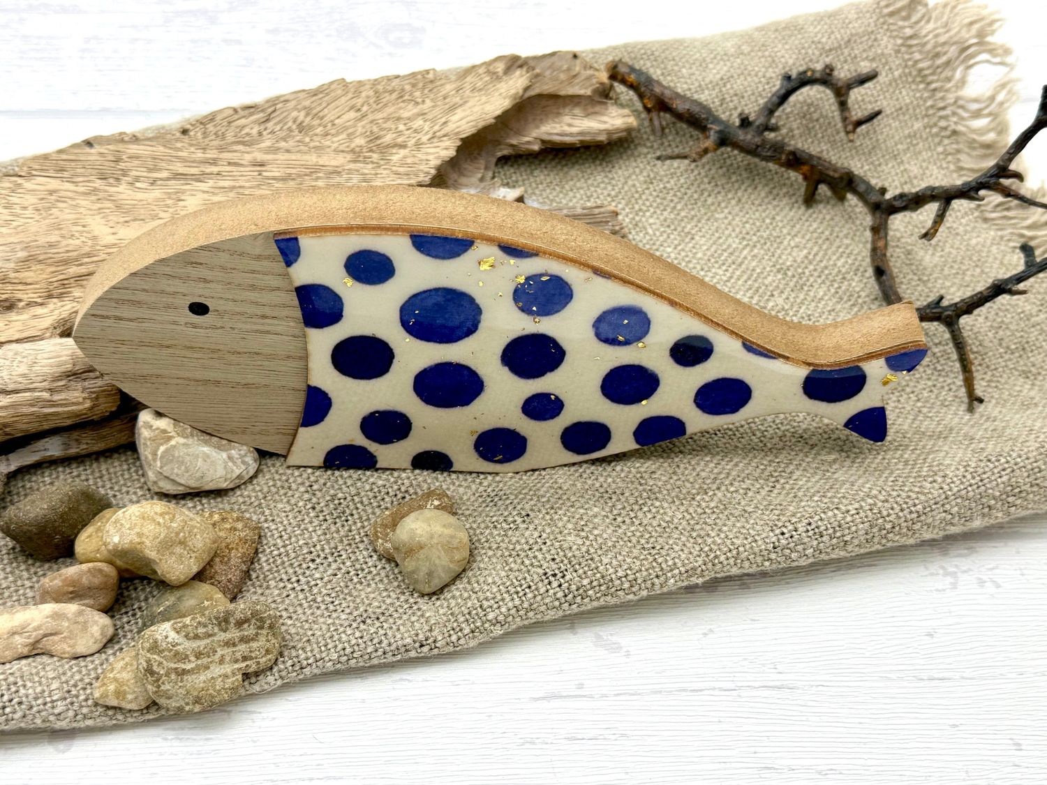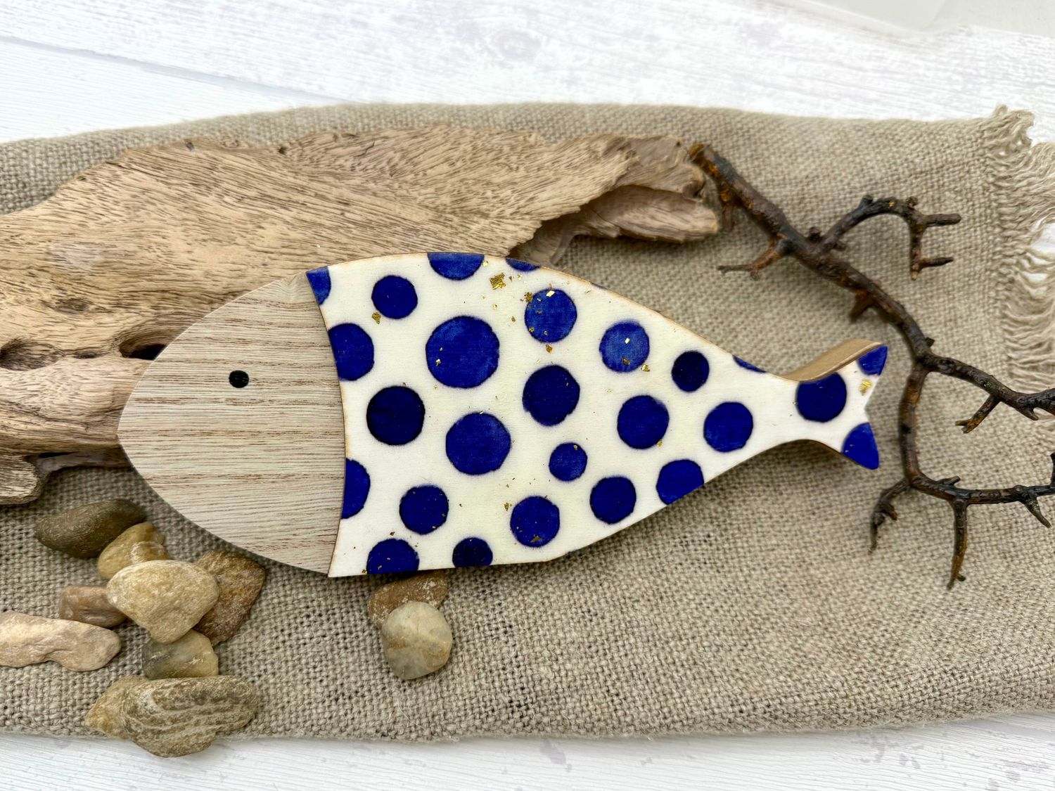 Maritimer Deko Fisch aus Holz zum Hinstellen – handbemalt mit blauen Punkten und Goldglitzer