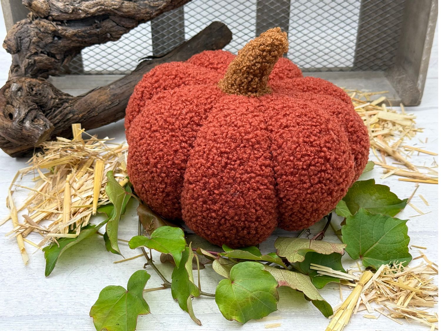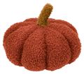 Ein Deko Kürbis mit einer weichen, plüschigen Textur wahlweise in den Farben Grün, Rot und Braun.