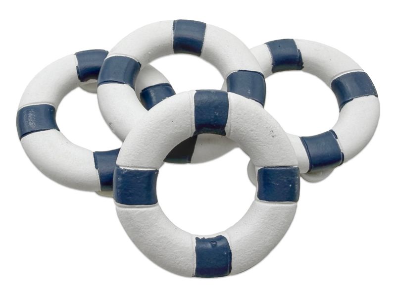 4 Stück kleine Deko Rettungsringe mit zwei Klebepunkten zur einfachen Befestigung, aus Polyresin in Blau-Weiß - als Dekoration und Verzierung.