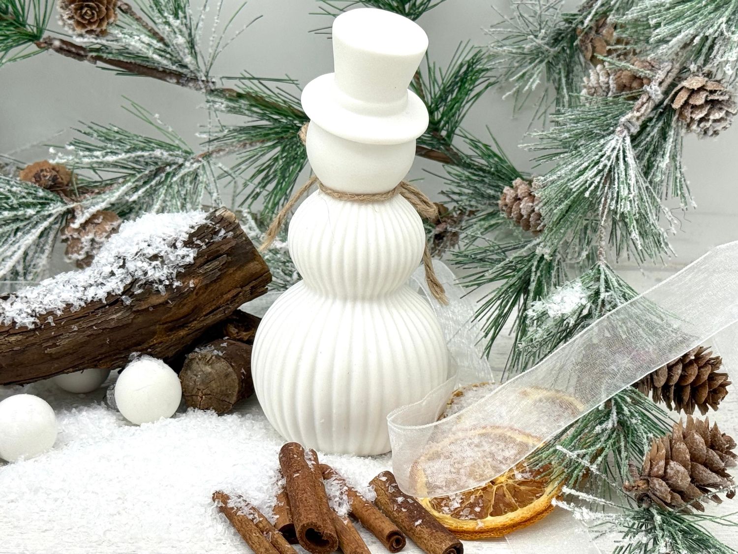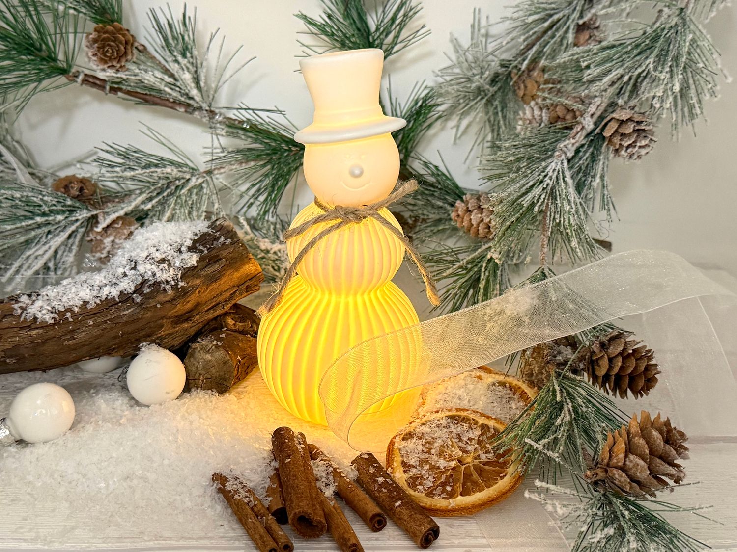 Der weiße Schneemann trägt eine dekorative Kordelschleife um den Hals und sorgt mit seinem warmen Licht für eine gemütliche Atmosphäre und winterlichen Glanz in der Adventszeit.