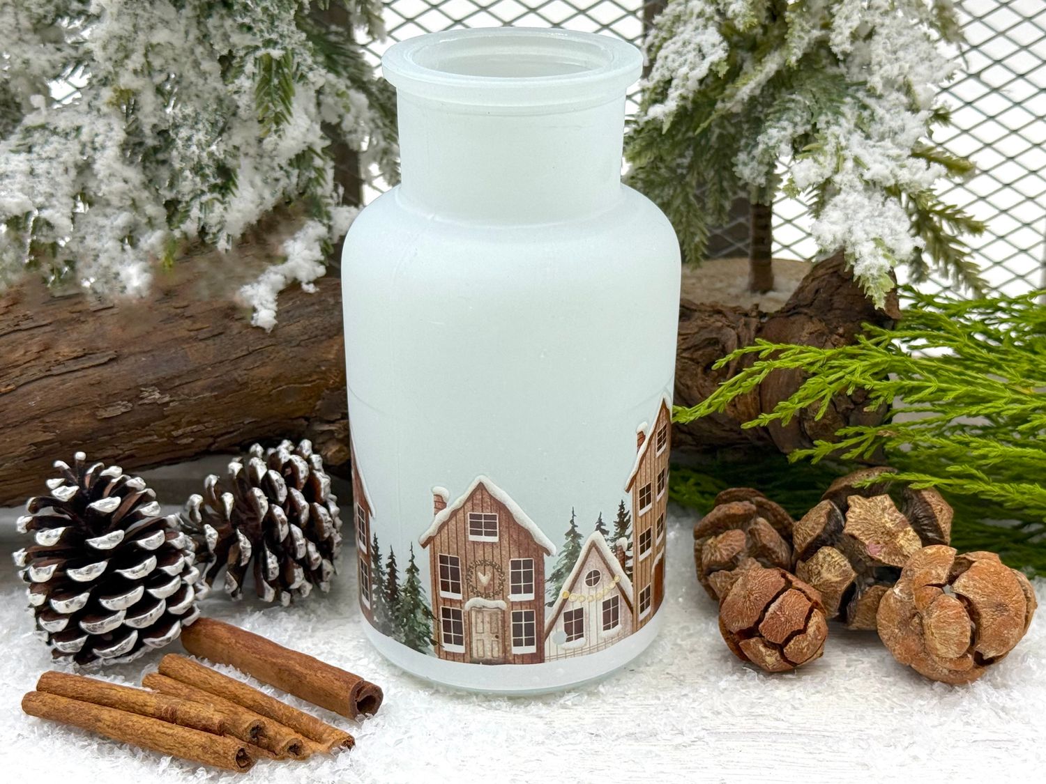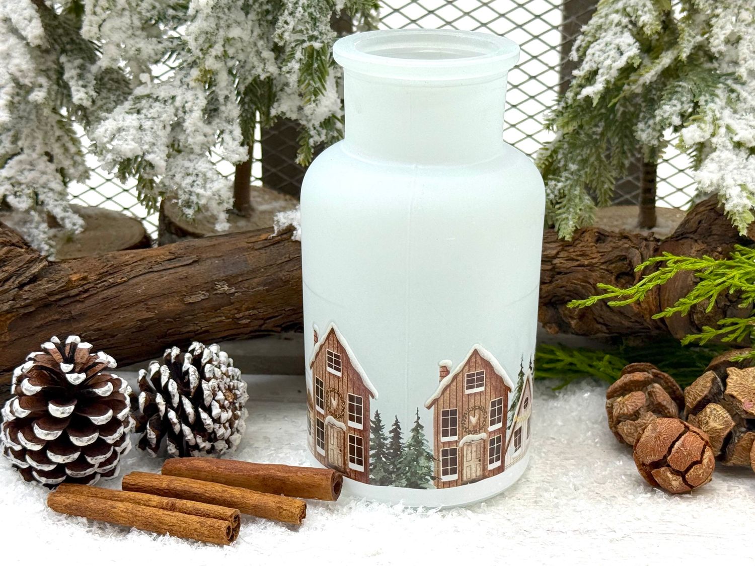 Eine Vase in Milchgals Optik mit winterlichen Motiv Design mit dekorierten Häusern, Tannenbäumen und Schnee