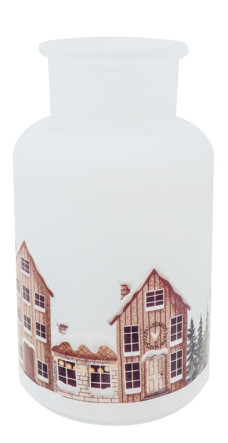 Sie haben Fragen zum Artikel Deko Vase aus Glas mit Winterlandschaft  Motiv – Milchglas-Optik dekoriert mit Häuser Advents- und Weihnachtsdeko 12,5cm H?