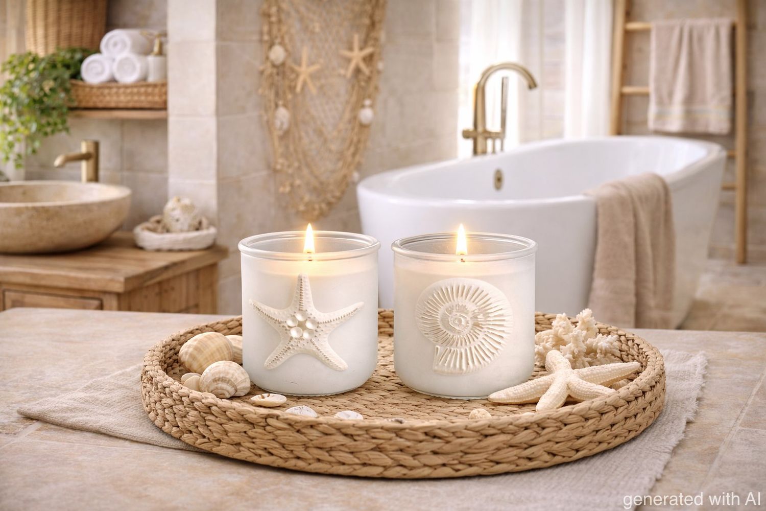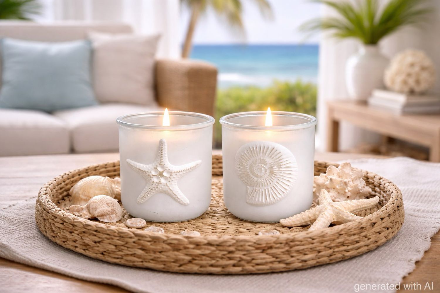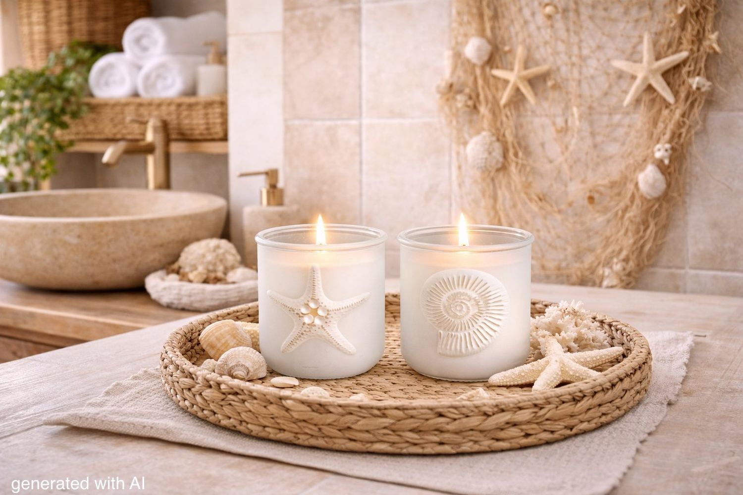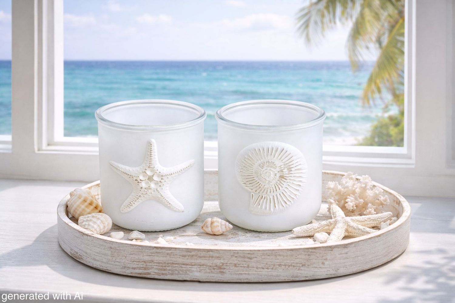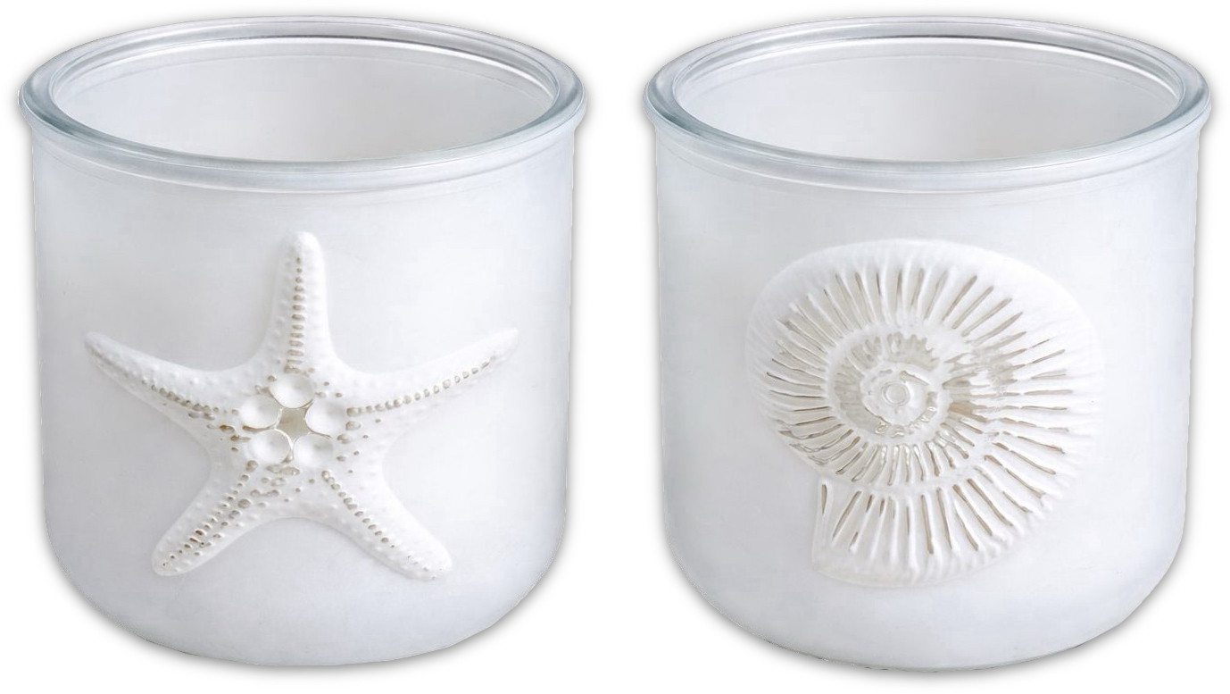 Zwei maritime Deko Windlichter - milchig weißes Glas mit 3D Seestern & Ammonit Muschel Motiv