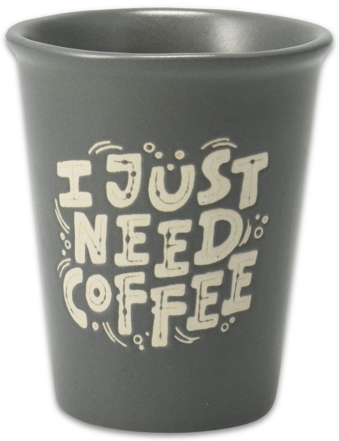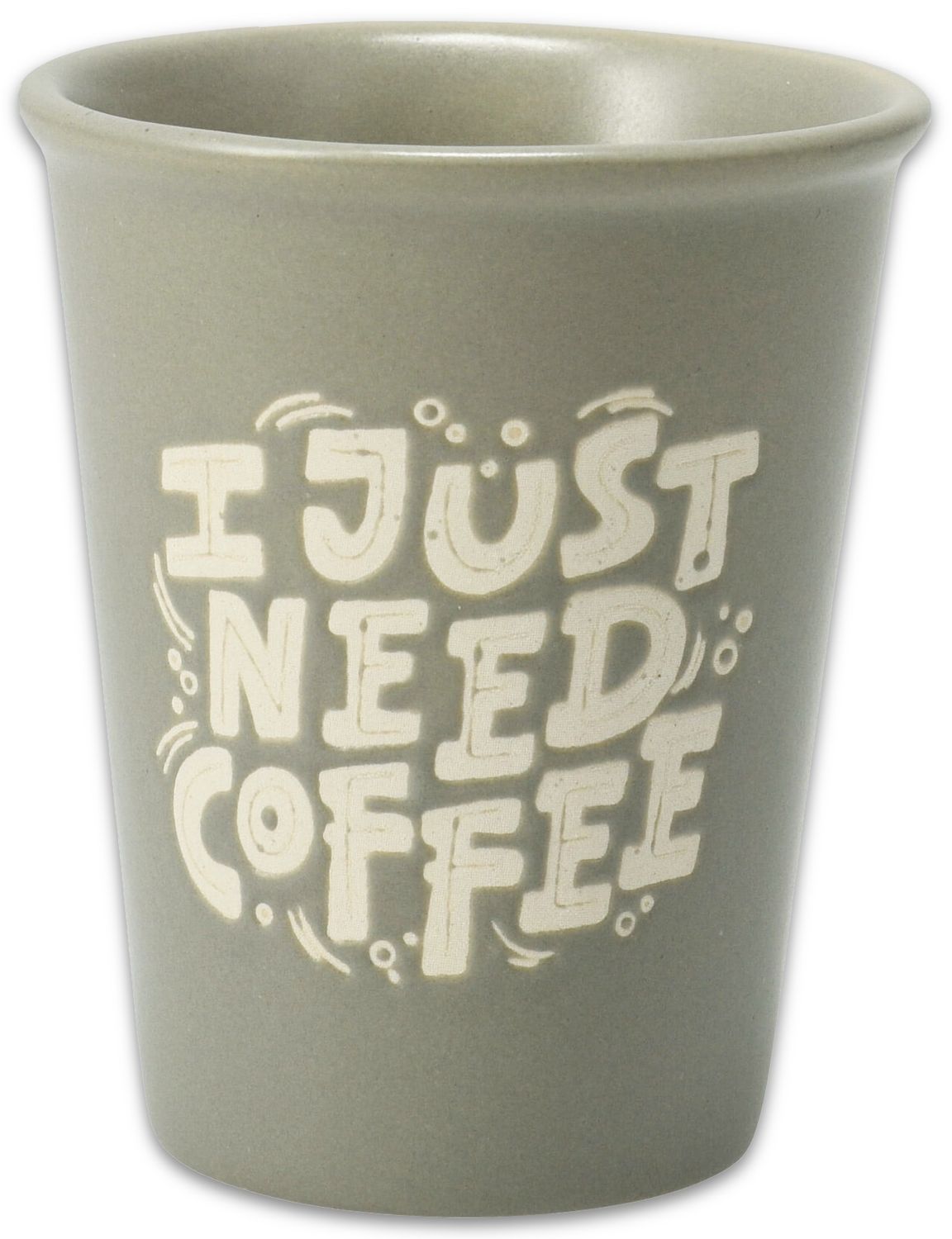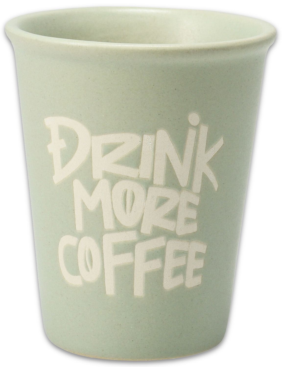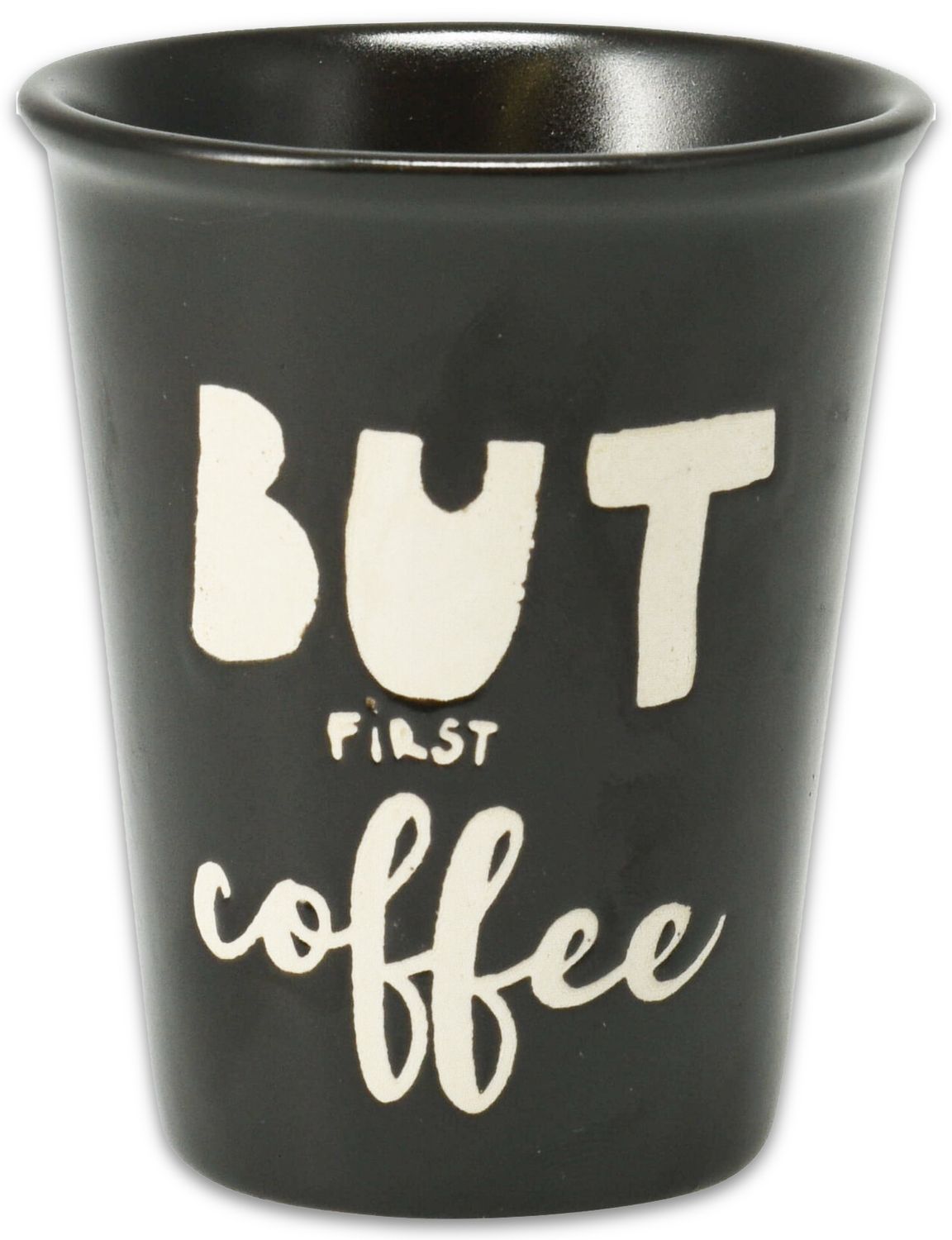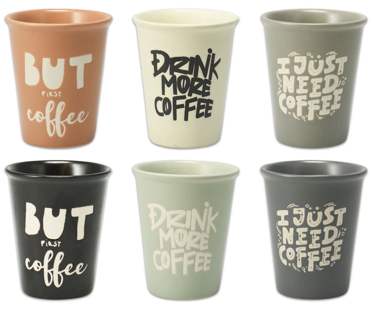 Ein Espressotasse - Espressobecher aus Porzellan, wahlweise aus sechs verschiedenen Farben und drei unterschiedlichen Motiven ("Drink more coffee", "But first coffee" & " I just need coffee")