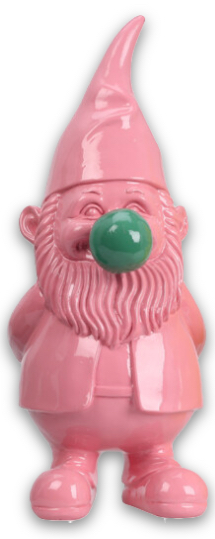 Ein Deko Gartenzwerg aus Kunststoff in Rosa mit grüner Knollennase