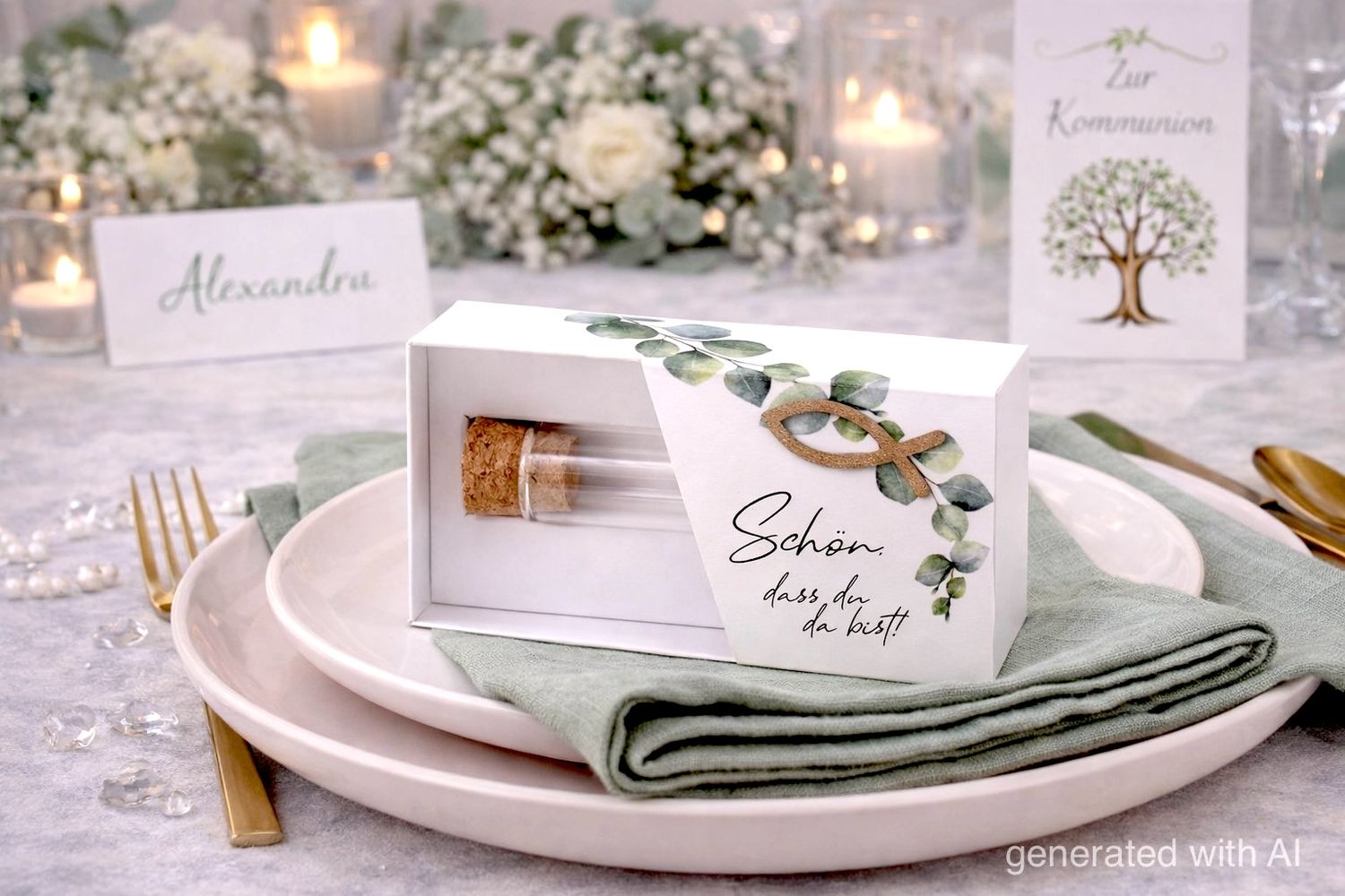 Gastgeschenk mit Eukalyptus Motiv, christlichem Fisch-Symbol und einem GlasröhrchenÂ