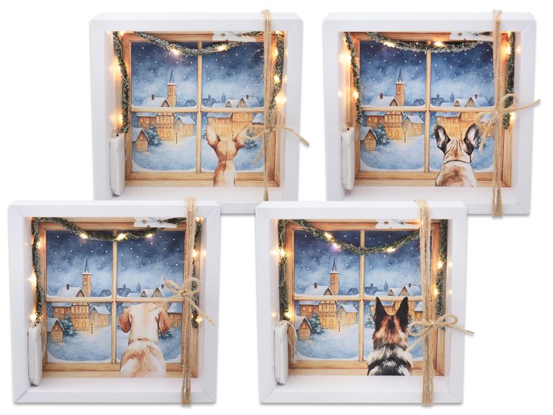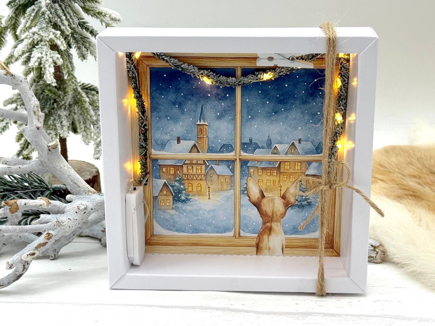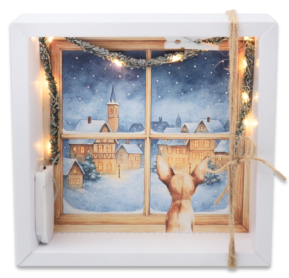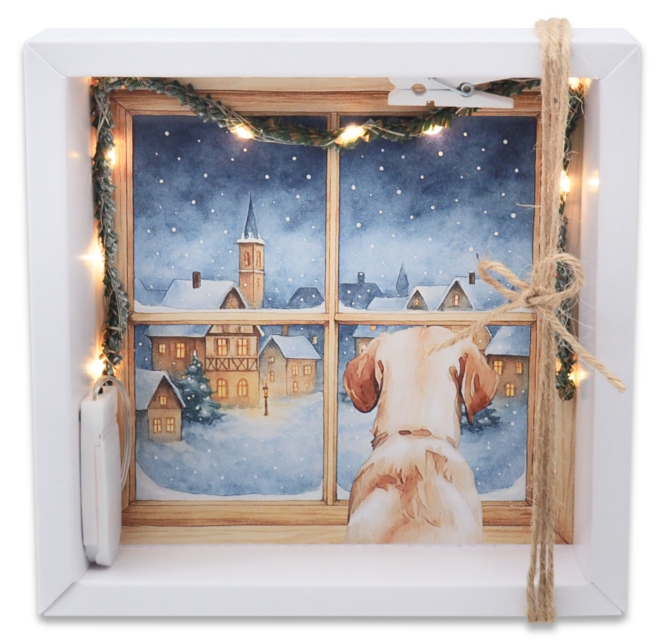 Inhalt: Im Inneren der Verpackung finden Sie eine stimmungsvoll leuchtende LED-Girlande und ein liebevoll gestaltetes Hintergrundbild: Ein Hund, der aus dem Fenster in ein verschneites Winterdorf blickt.