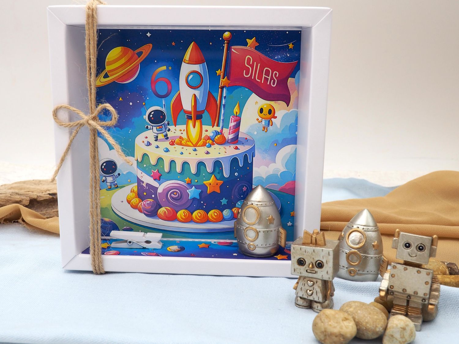 Inhalt: eine kleine Rakete und ein fantasievoller Hintergrunddruck im Weltraum-Stil, nach Wunsch personalisiert mit Name und Alter.