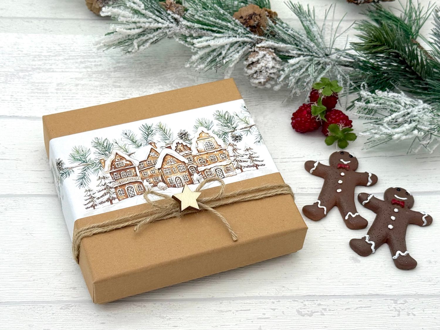 Außen ist die Box verziert mit einer Banderole mit Lebkuchenhäusern mit einer Zweiggirlande und einer Naturkordel, sowie ein Holzstern.