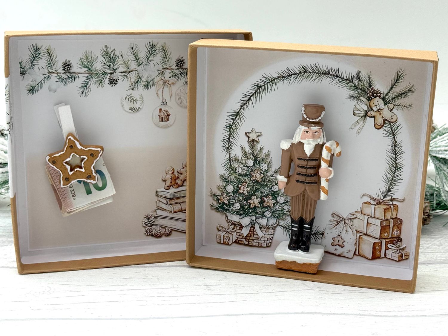 Handgefertigte Weihnachts-Geldgeschenk Verpackung -Box „Nussknacker & Lebkuchen“ – dekorative Geschenkverpackung aus naturfarbener Kartonage