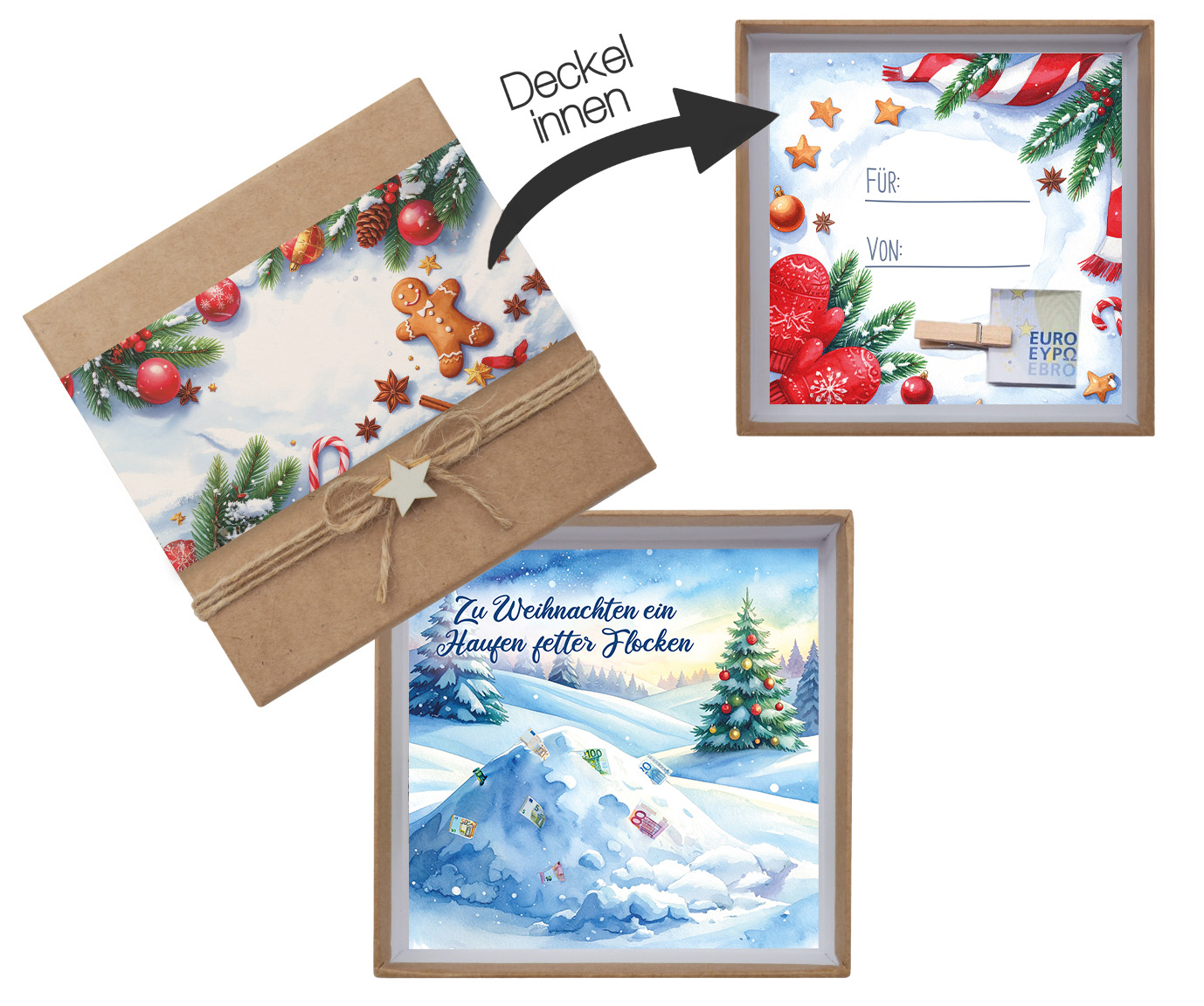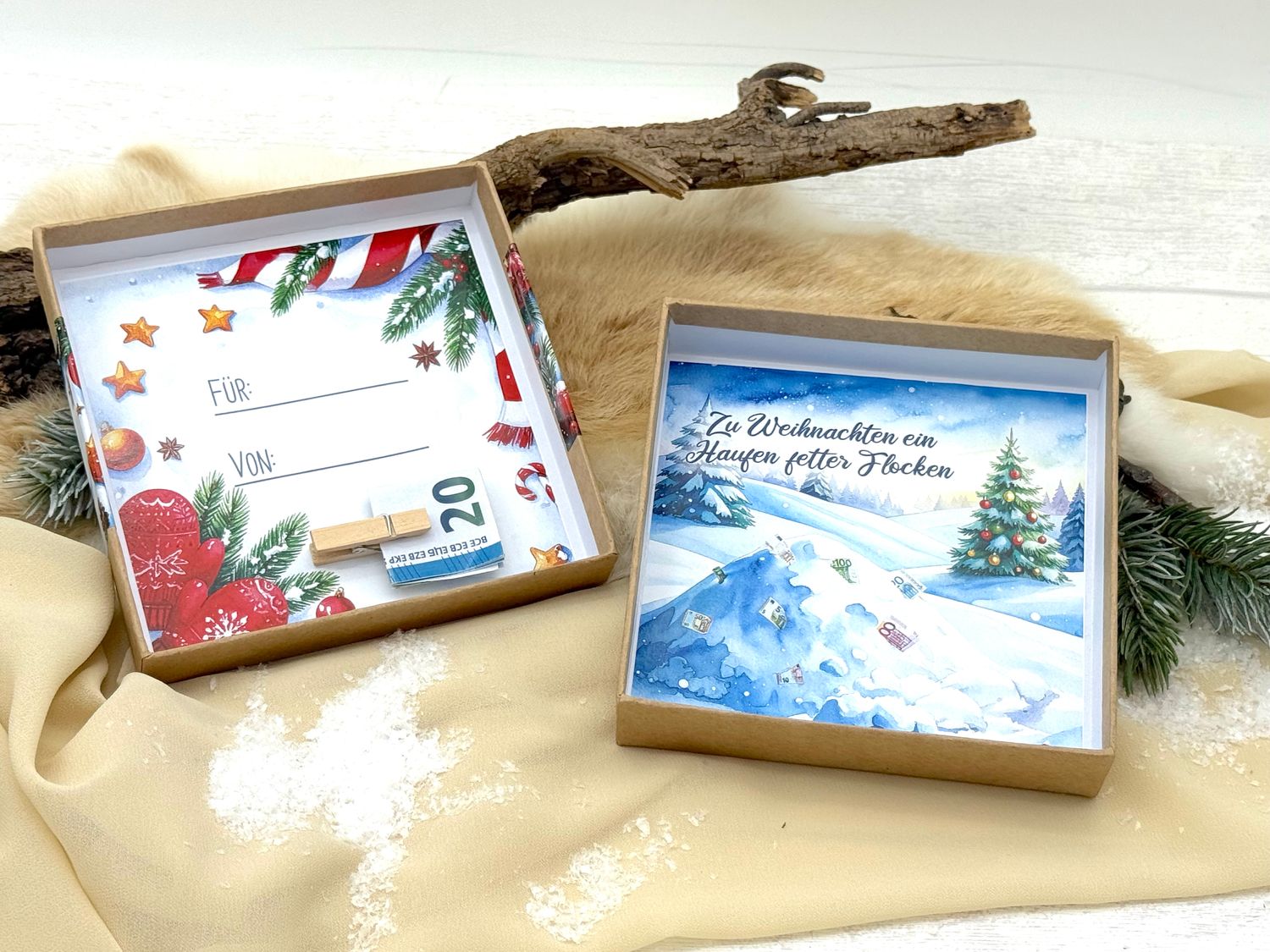 Mit ihrem detailreichen, weihnachtlichen Design sorgt sie schon beim Überreichen für ein Lächeln – und macht aus einem einfachen Geldgeschenk eine originelle Aufmerksamkeit mit Herz.