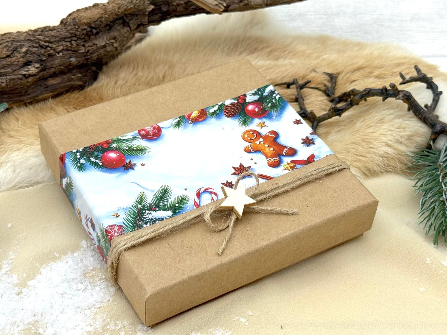 Außen ist die Box verziert mit einer Banderole mit verschiedenen weihnachtlichen Motiven und einer Naturkordel, sowie ein Holzstern.