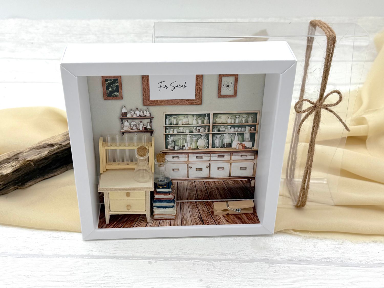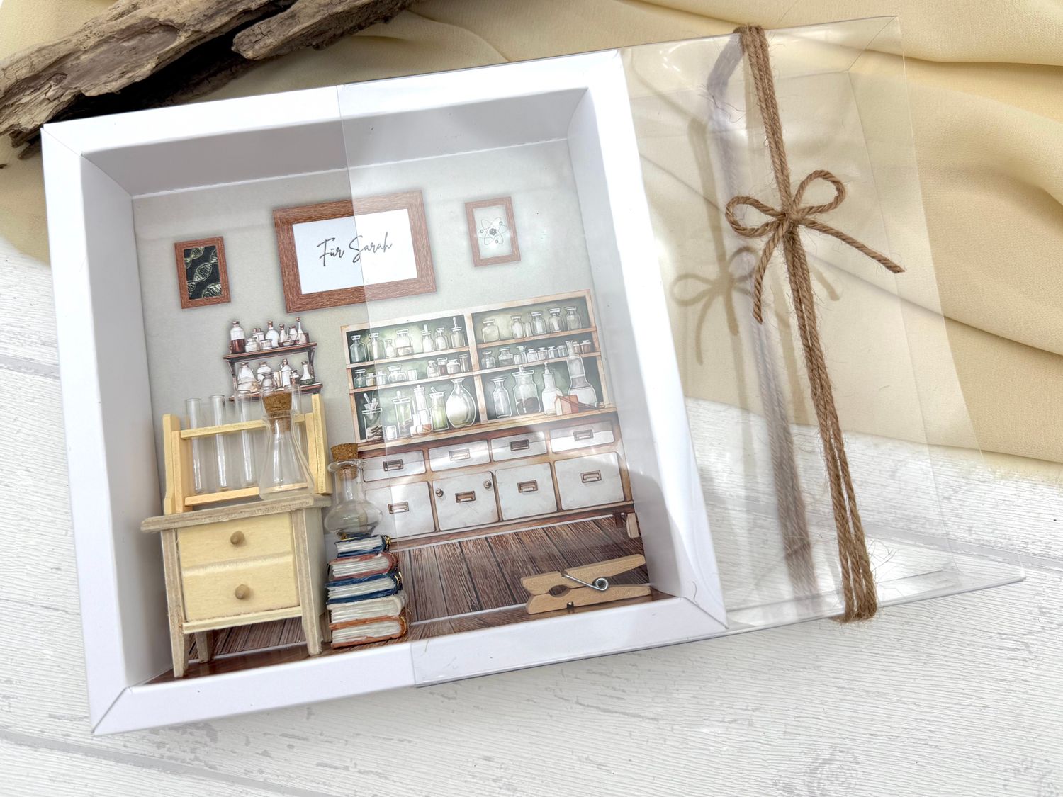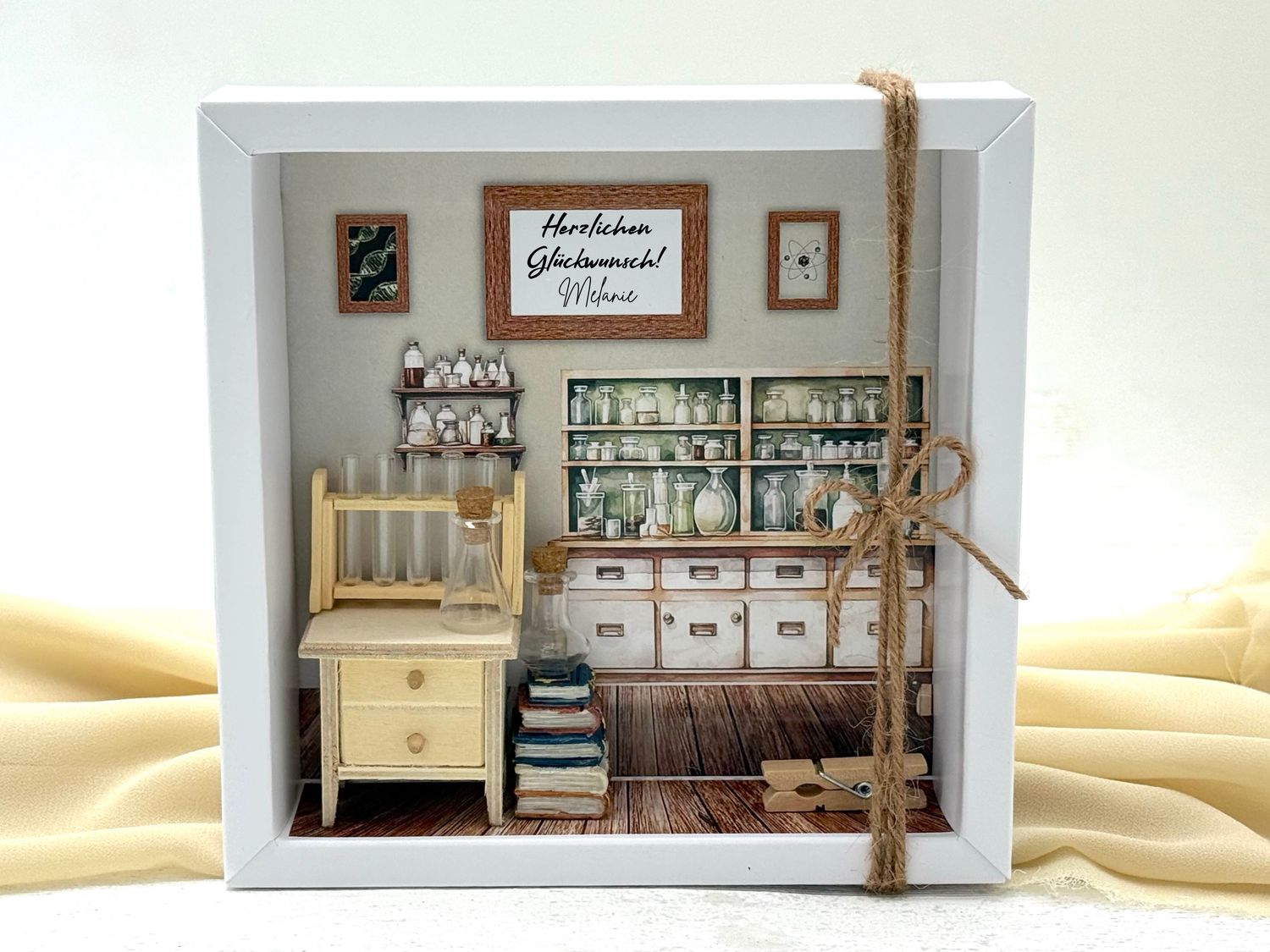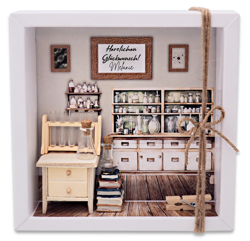 Durch den transparenten Schiebedeckel fällt der Blick direkt in ein Miniatur-Labor, in dem sich Kommode, Bücherstapel, Reagenzglasständer und Kolben zu einer charmanten Szene verbinden.