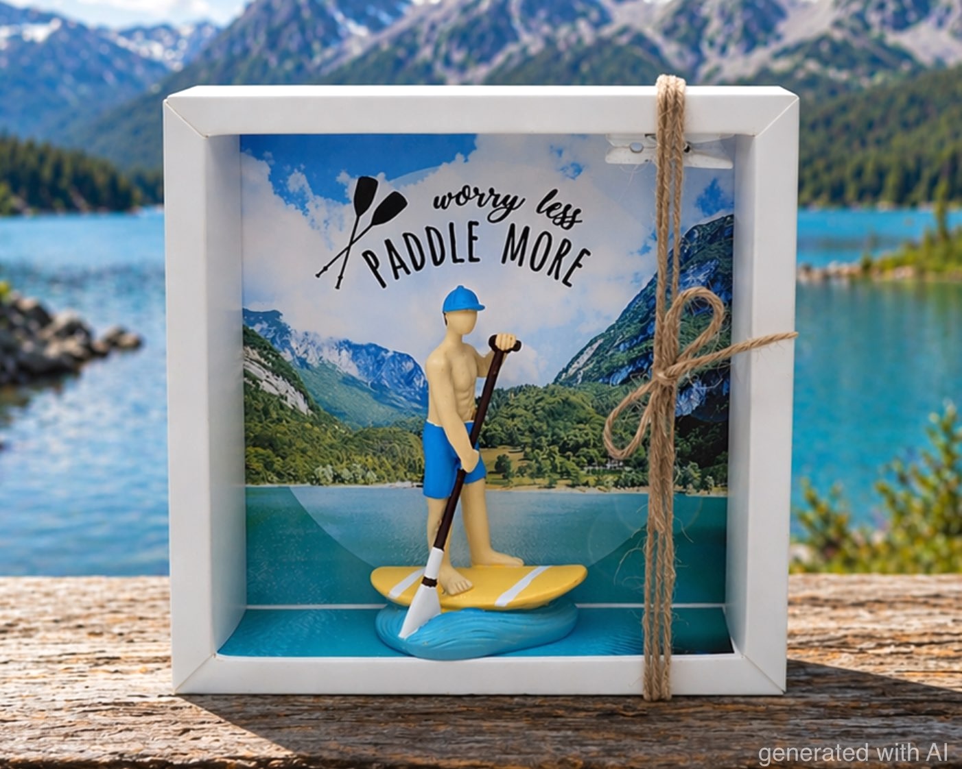 Miniatur-Szene mit Stand Up Paddler aus Polyresin, eine Holzklammer, sowie Hintergrund mit einem See und Spruch "Worry less - paddle more"