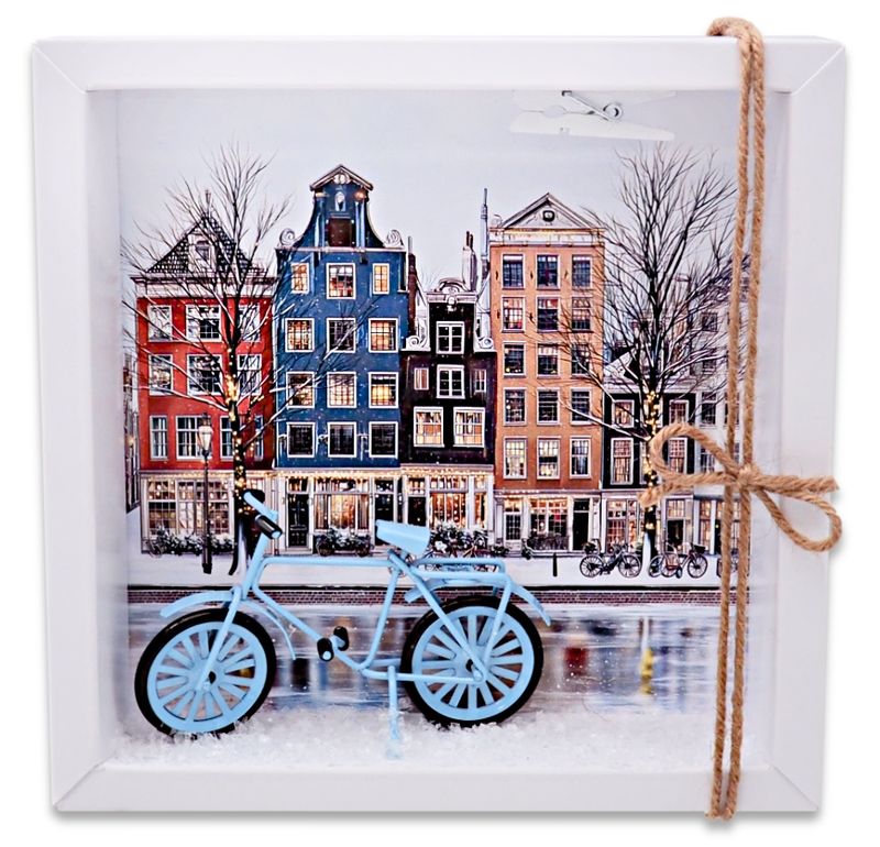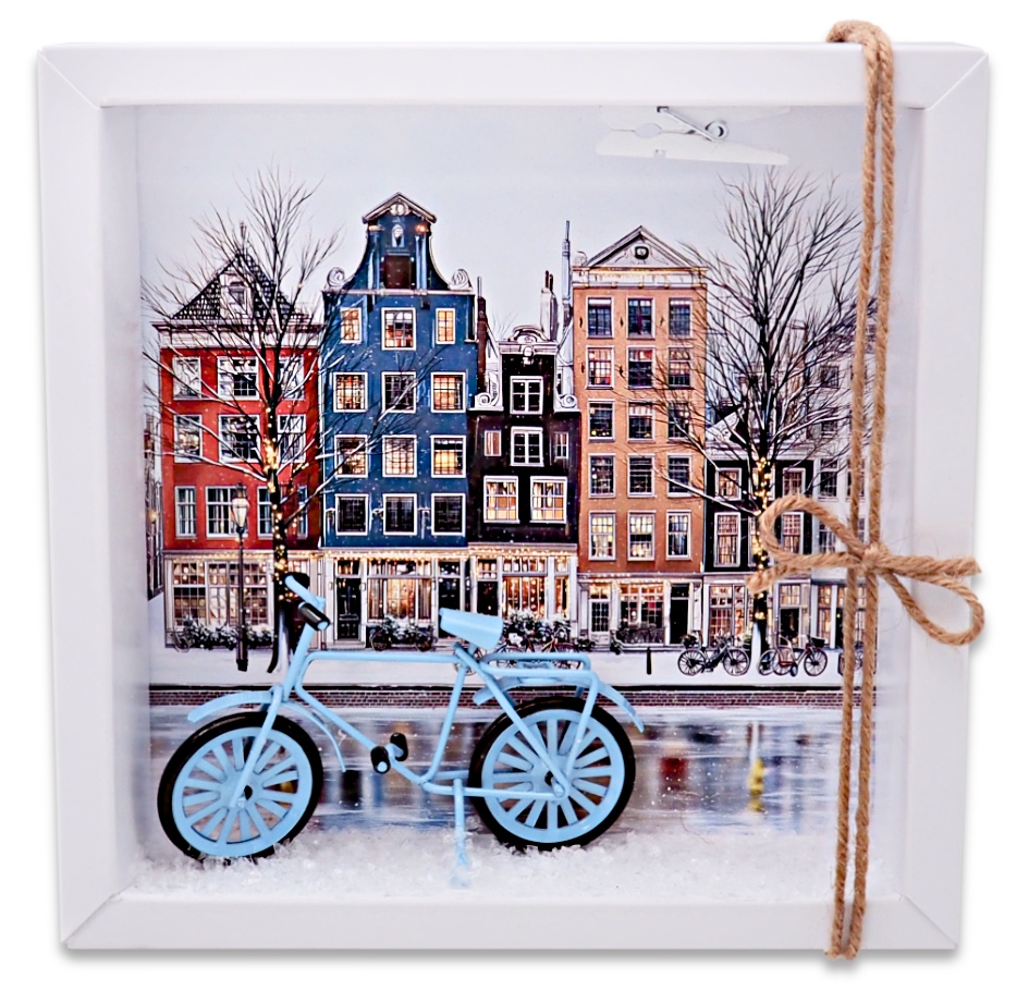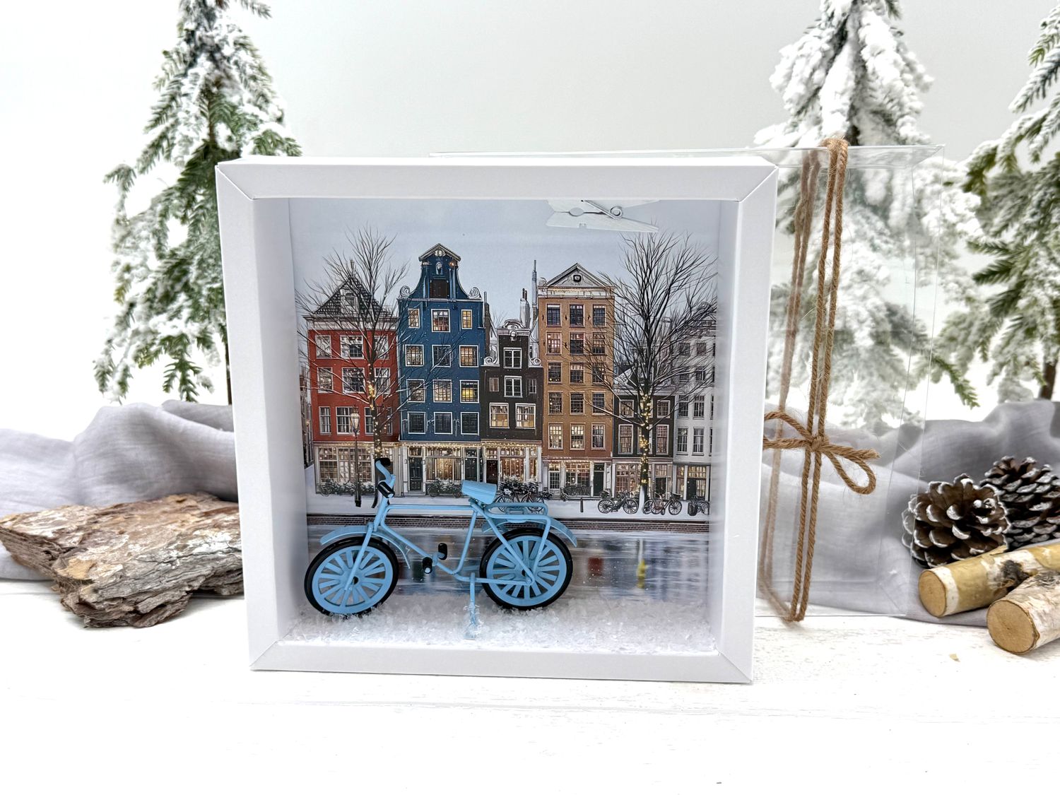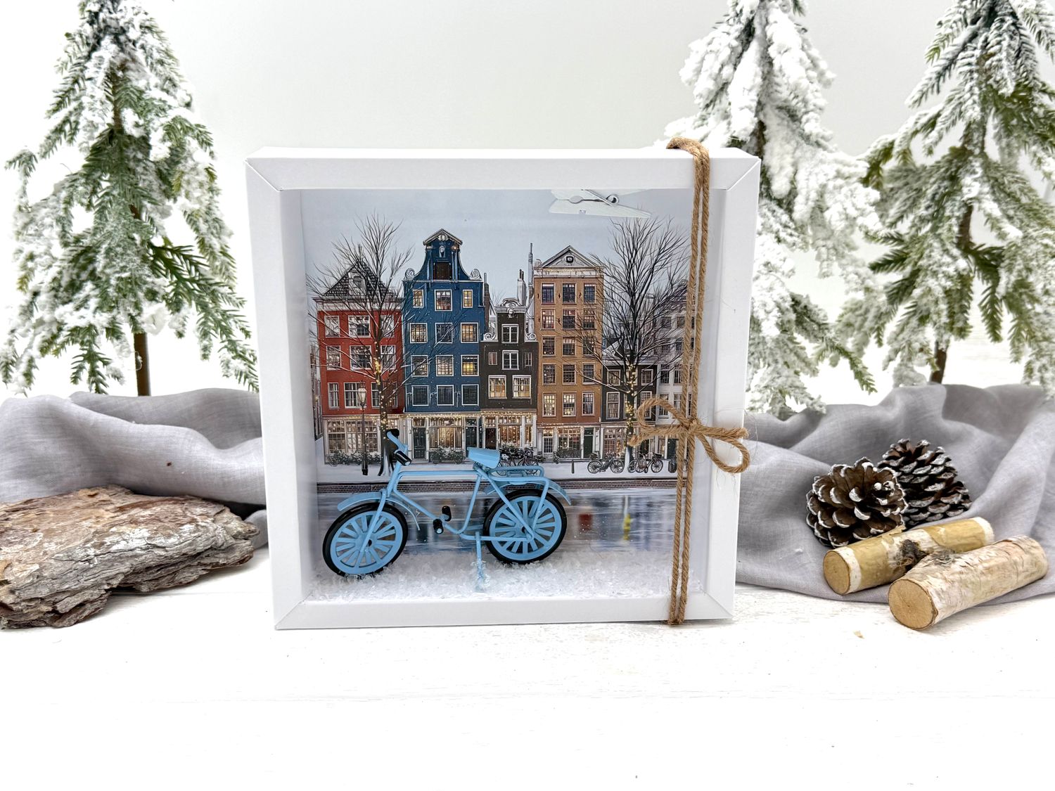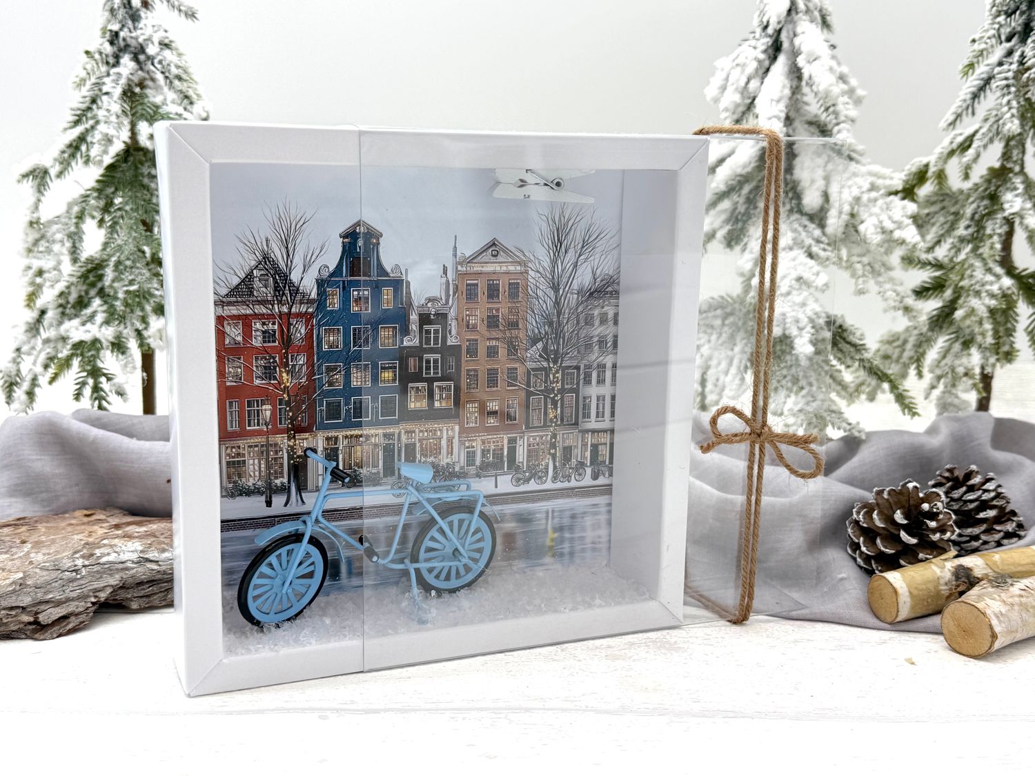 Inhalt: Eine Miniatur-Figur eines Fahrrads im Schnee und ein auf Papier gedrucktes Hintergrundbild, das das winterlich geschmückte Amsterdam zeigt mit bunter, typischer Grachtenhäuser und geparkter Fahrräder am Kanal.