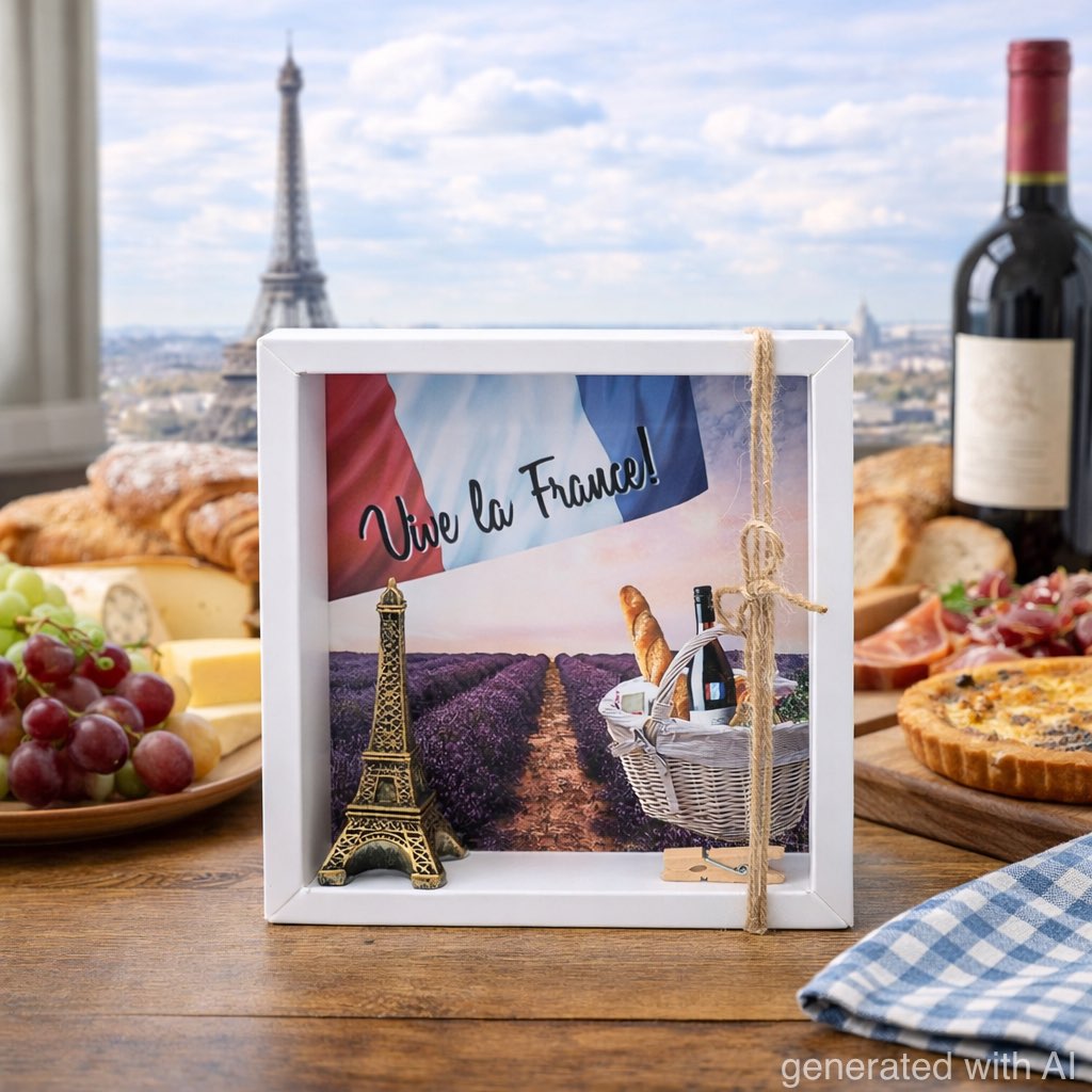 Inhalt: eine Dekofigur Eiffelturm sowie ein Hintergrundbild mit französischen Motiven auf Papier gedruckt.